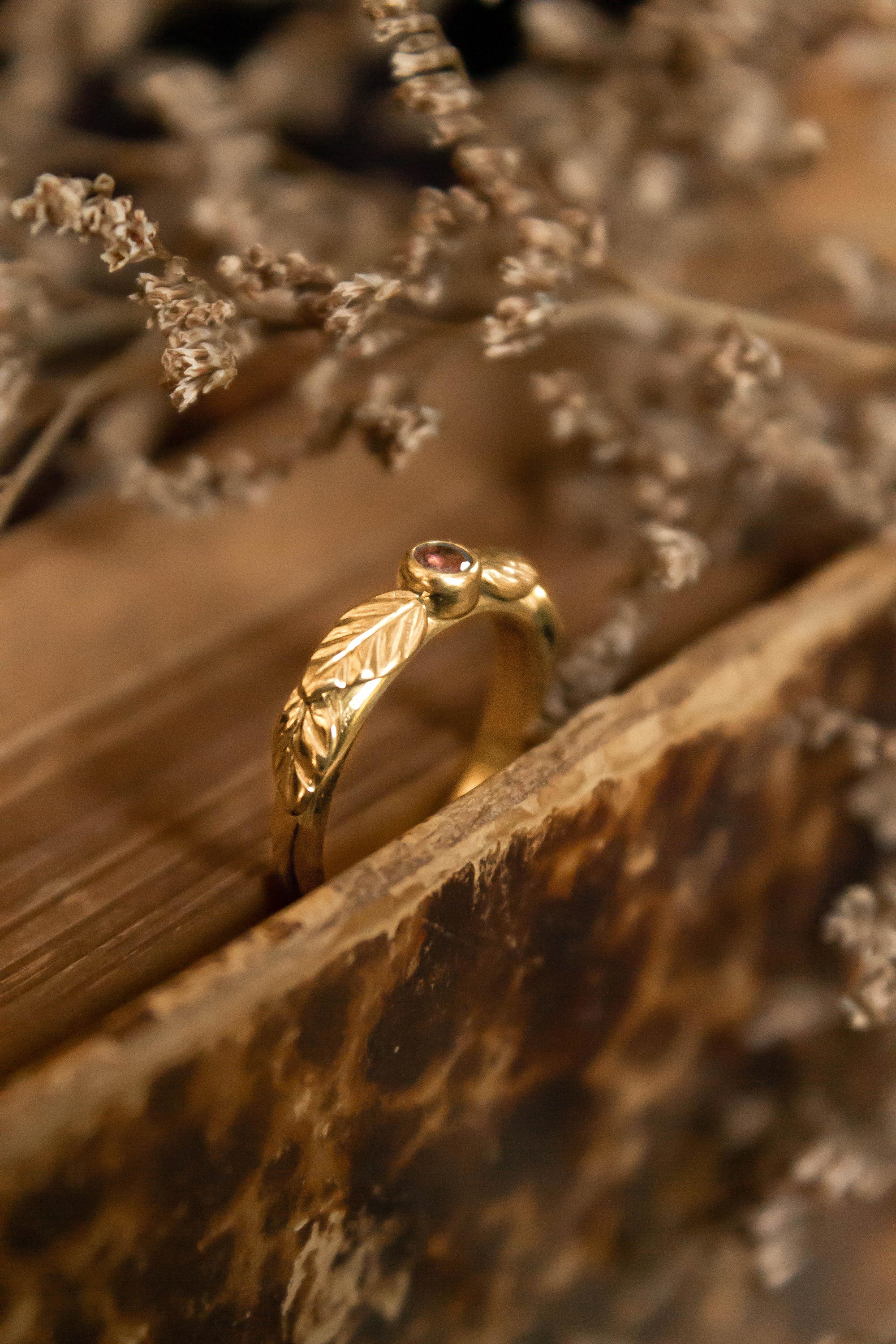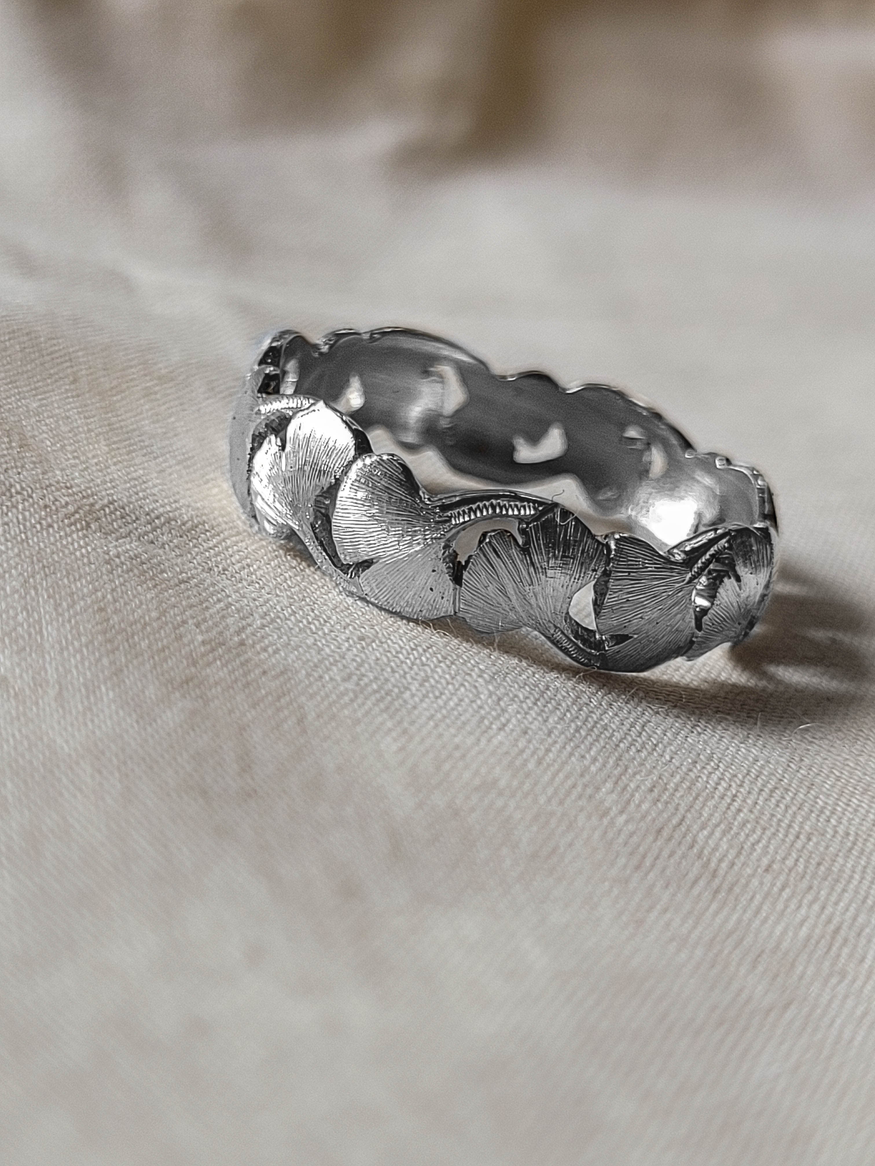 Anillo calado en forma de hojitas de ginkgo, con una forma de media caña lo que hace que sus bordes estén redondeados. Cada hojita está grabada a mano con buril de mil líneas para dar textura a la hoja, similar a la real. Y el tallo está grabado con la técnica de tremblé.