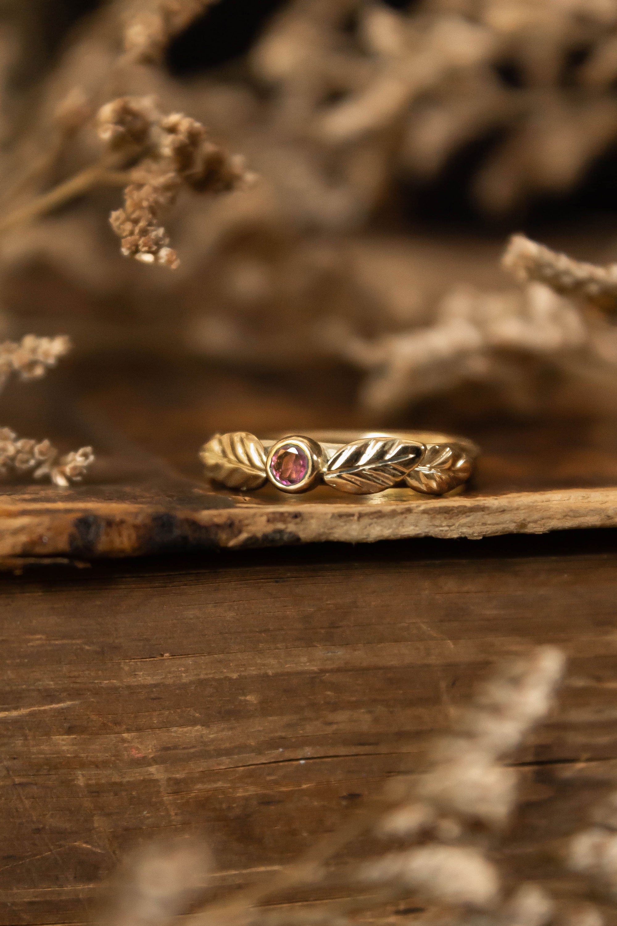 Anillo de compromiso con piedra central, en este cado una turmalina rubelita, con dos hojas de raulí a cada lado.