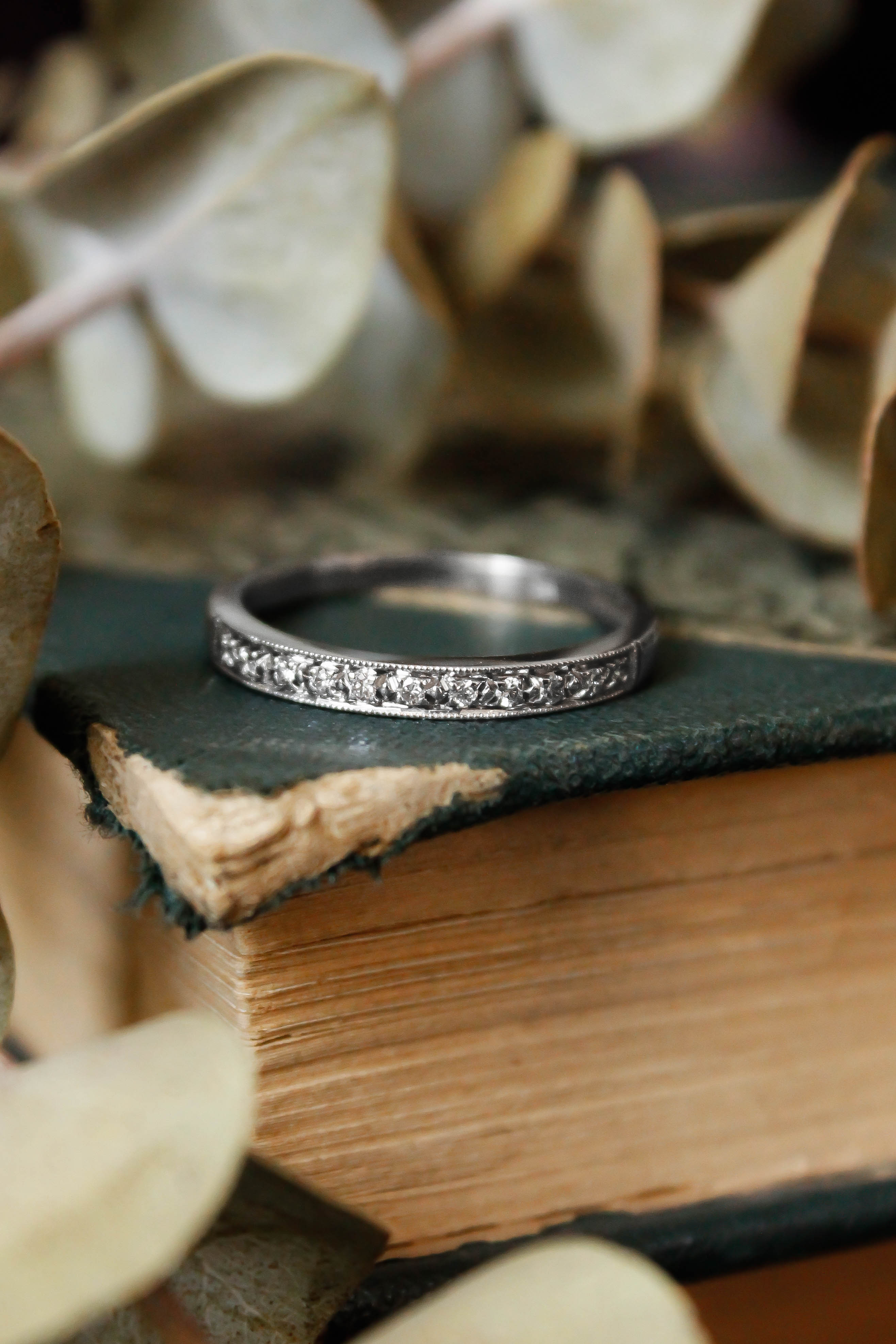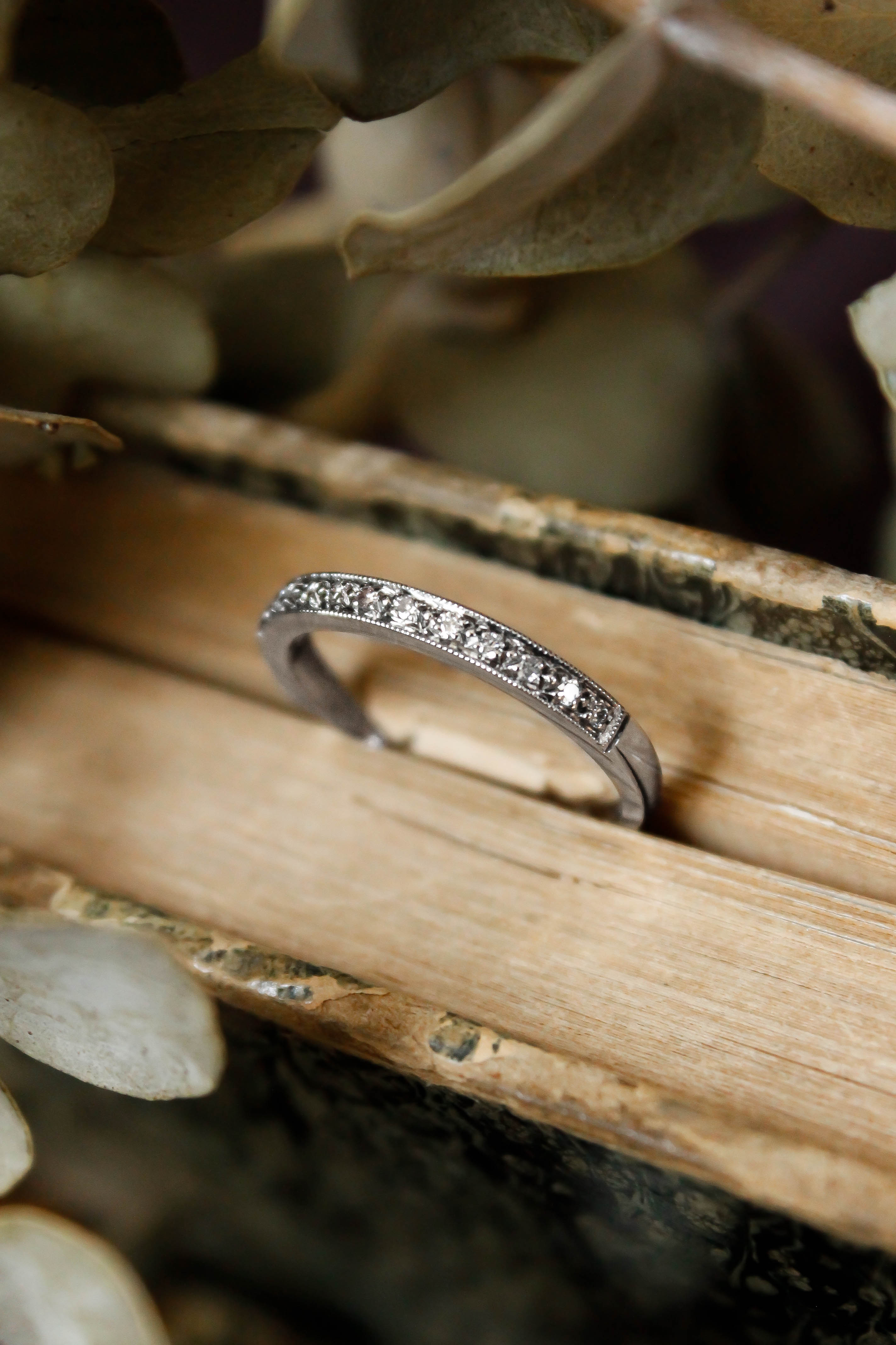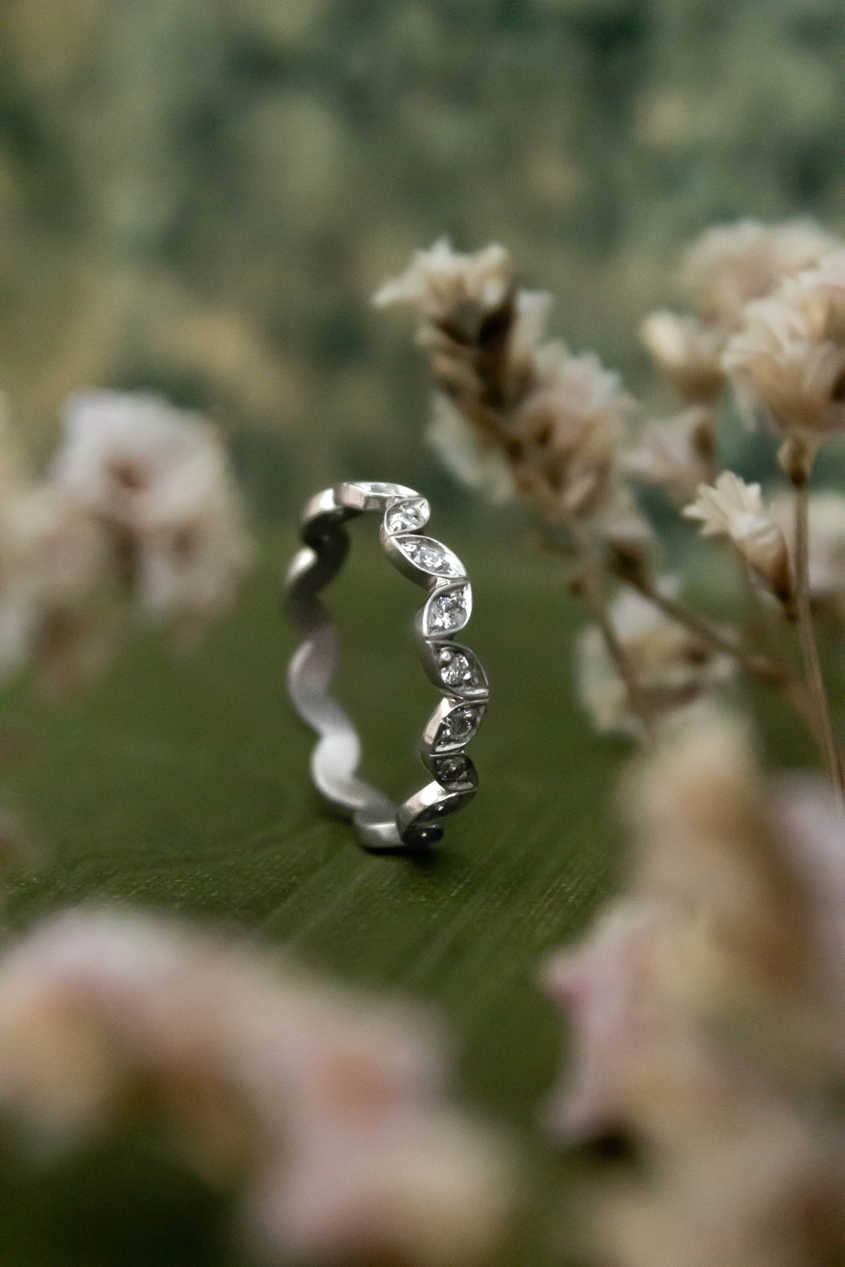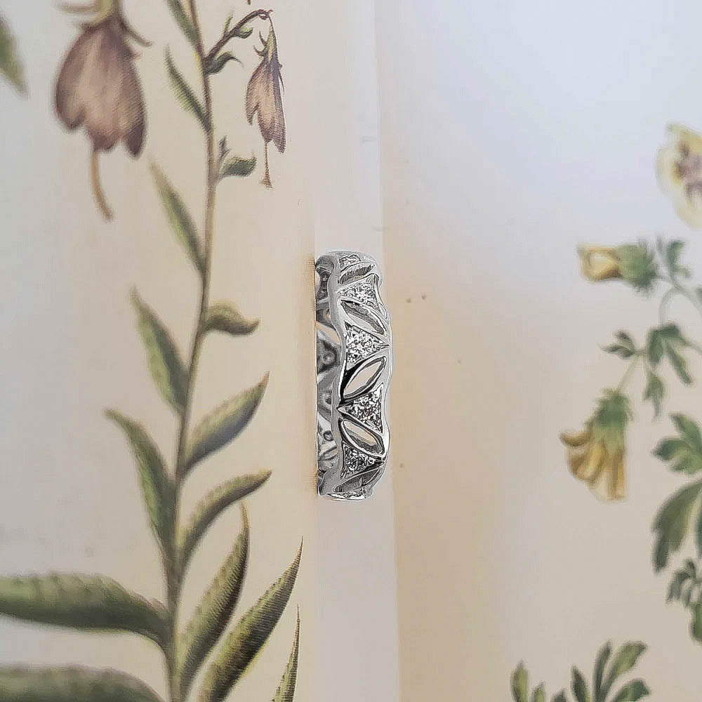 Anillo estilo Florentino, con hojitas redondeadas y engastes en medio cintillo (mitad de anillo con piedras) o cintillo completo (circunferencia entera con piedras). Hecho en platino y diamantes. ¡