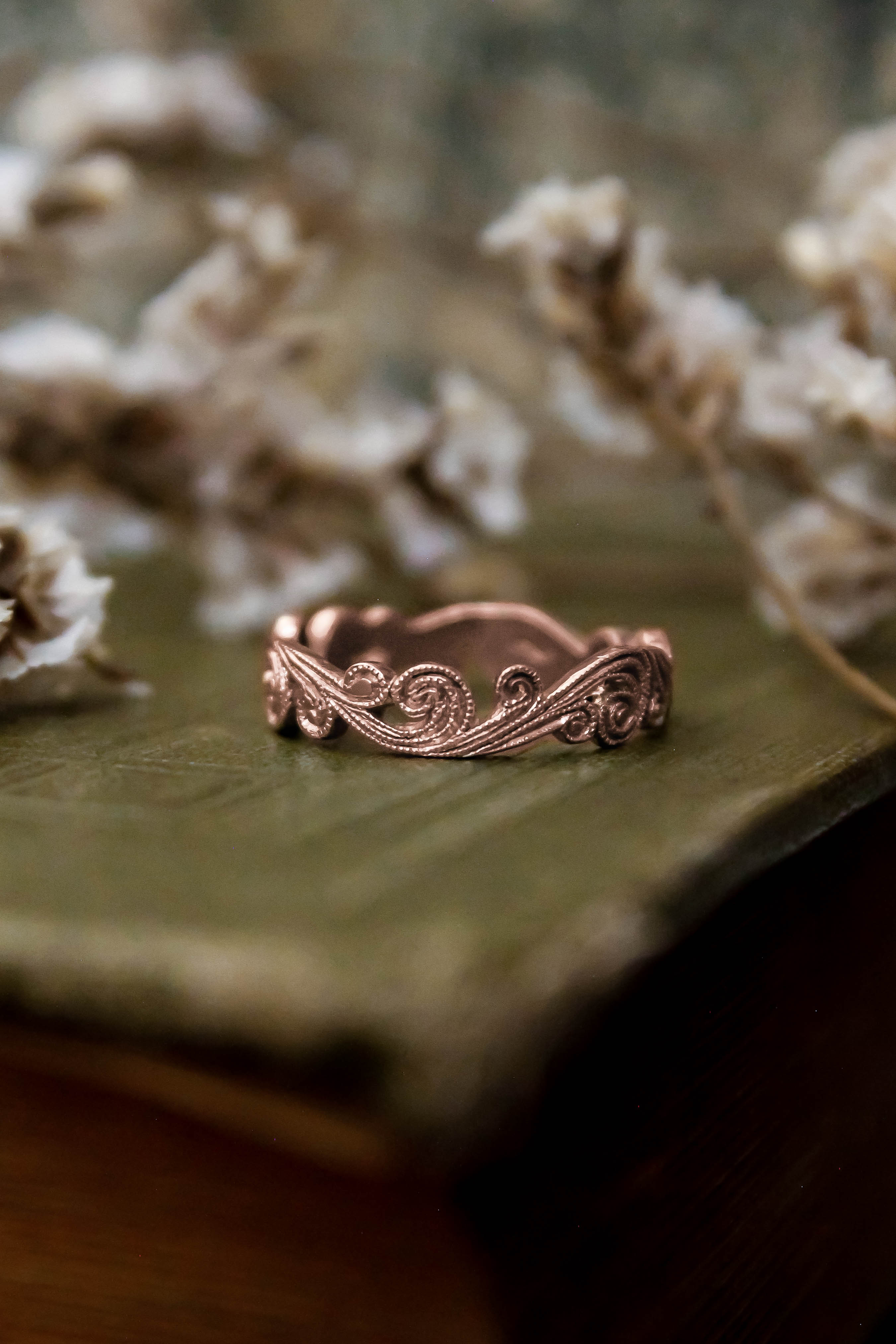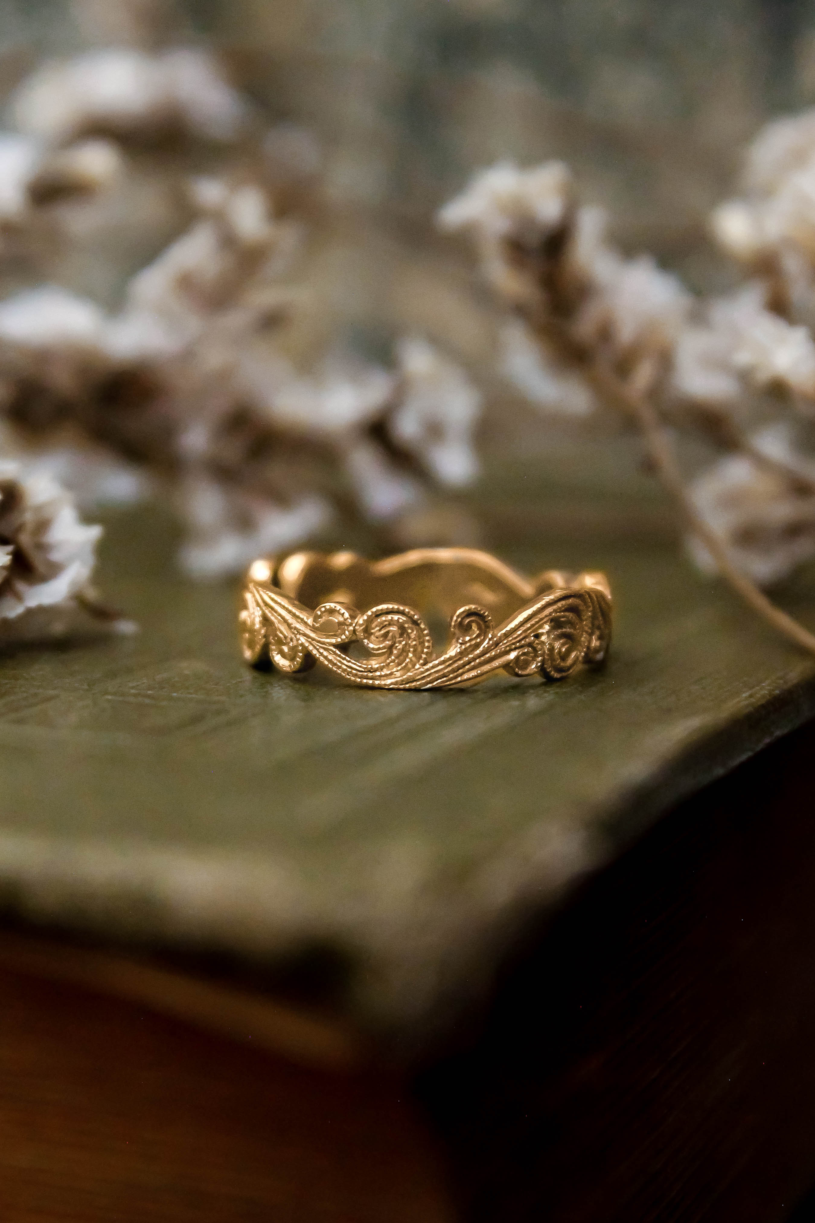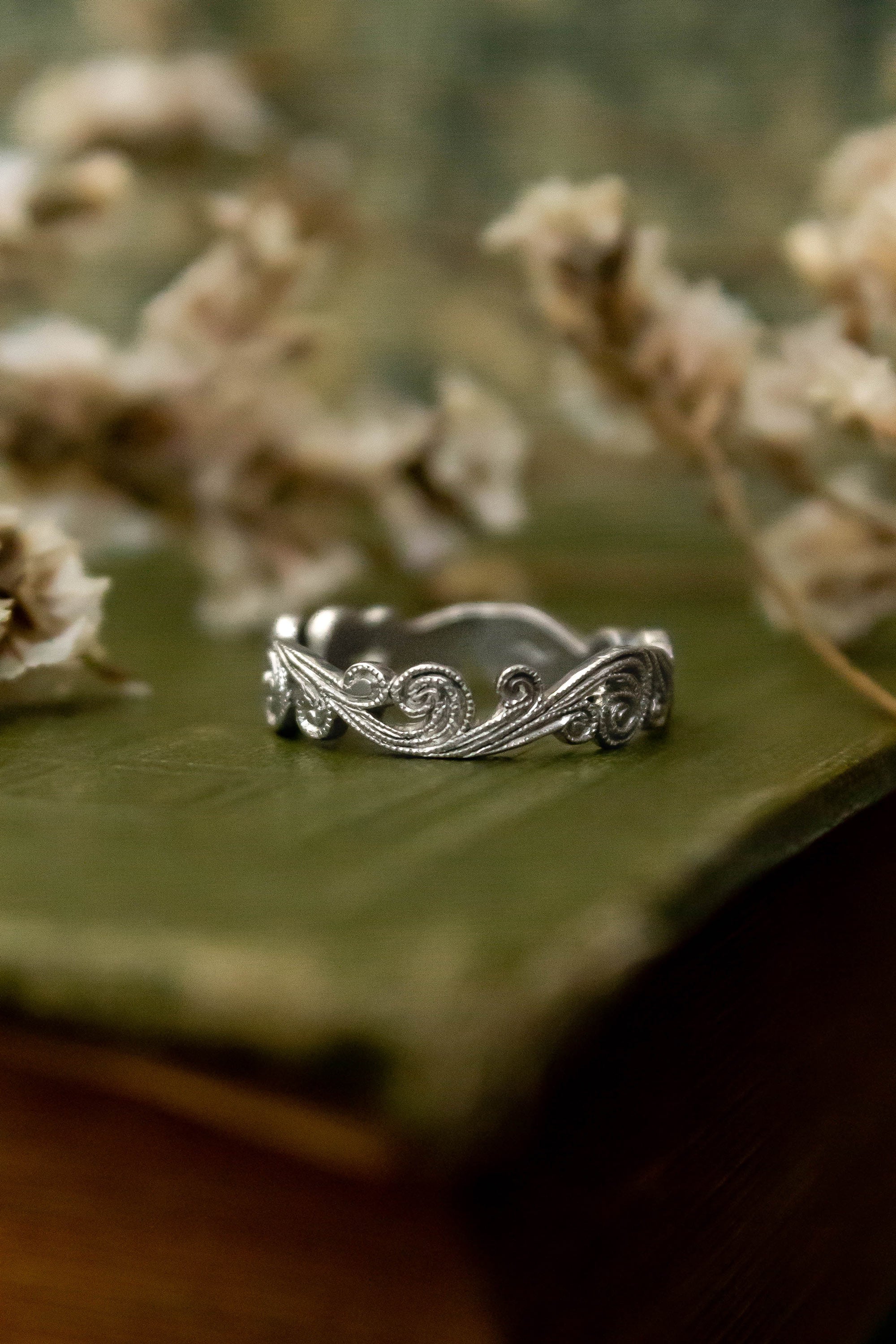 Anillo calado y grabado en forma de scroll. Los tallados a buril y la miligrana en el metal hacen que este anillo tenga muchos puntos de brillo y que parezca que tiene piedras pero realmente es solo el trabajo de grabado.