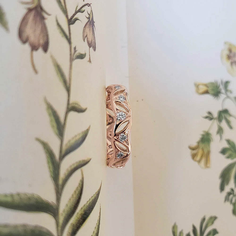 Anillo estilo florentino con calado en forma de semillas y engaste de diamantes.