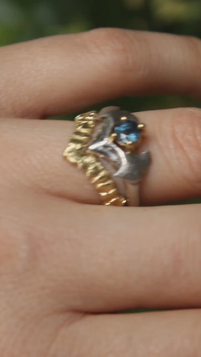 Anillo inspirado en las hojitas del árbol de Ginkgo, con dos colores distintos de metal. Está hecho en platino con el cajón que sostiene la piedra en oro amarillo. Piedra central zafiro azul. Recuerda que este diseño lo podemos hacer personalizado con la piedra y metal que más te guste. Además, podemos hacer la argolla de matrimonio después calzando perfectamente con un anillo como este en forma de v.