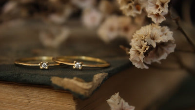 Este es un ejemplo de anillos muy sencillos y delicados. Con una banda muy delgadita y redondeada y un pequeño diamante engastado en grifas.