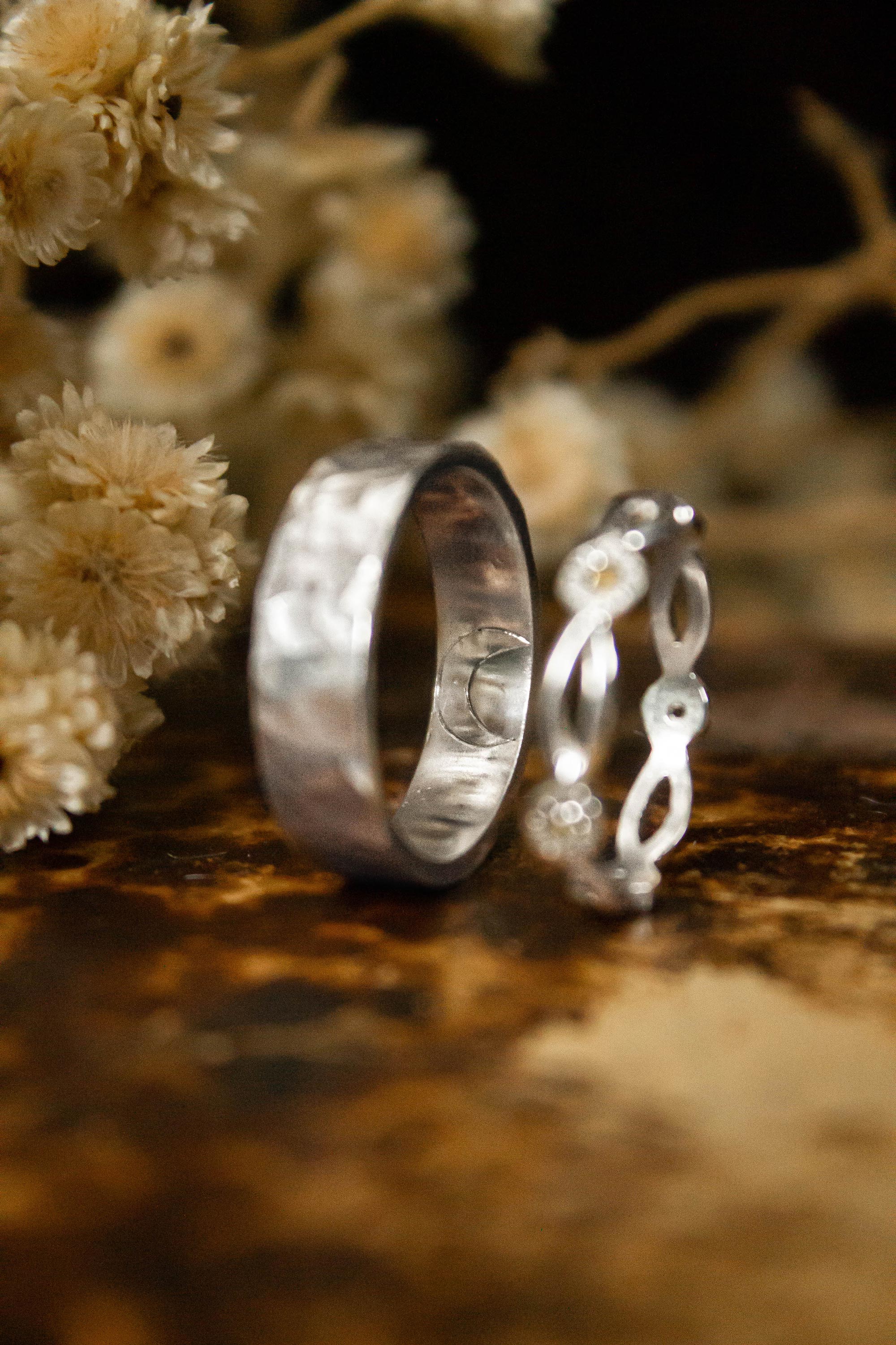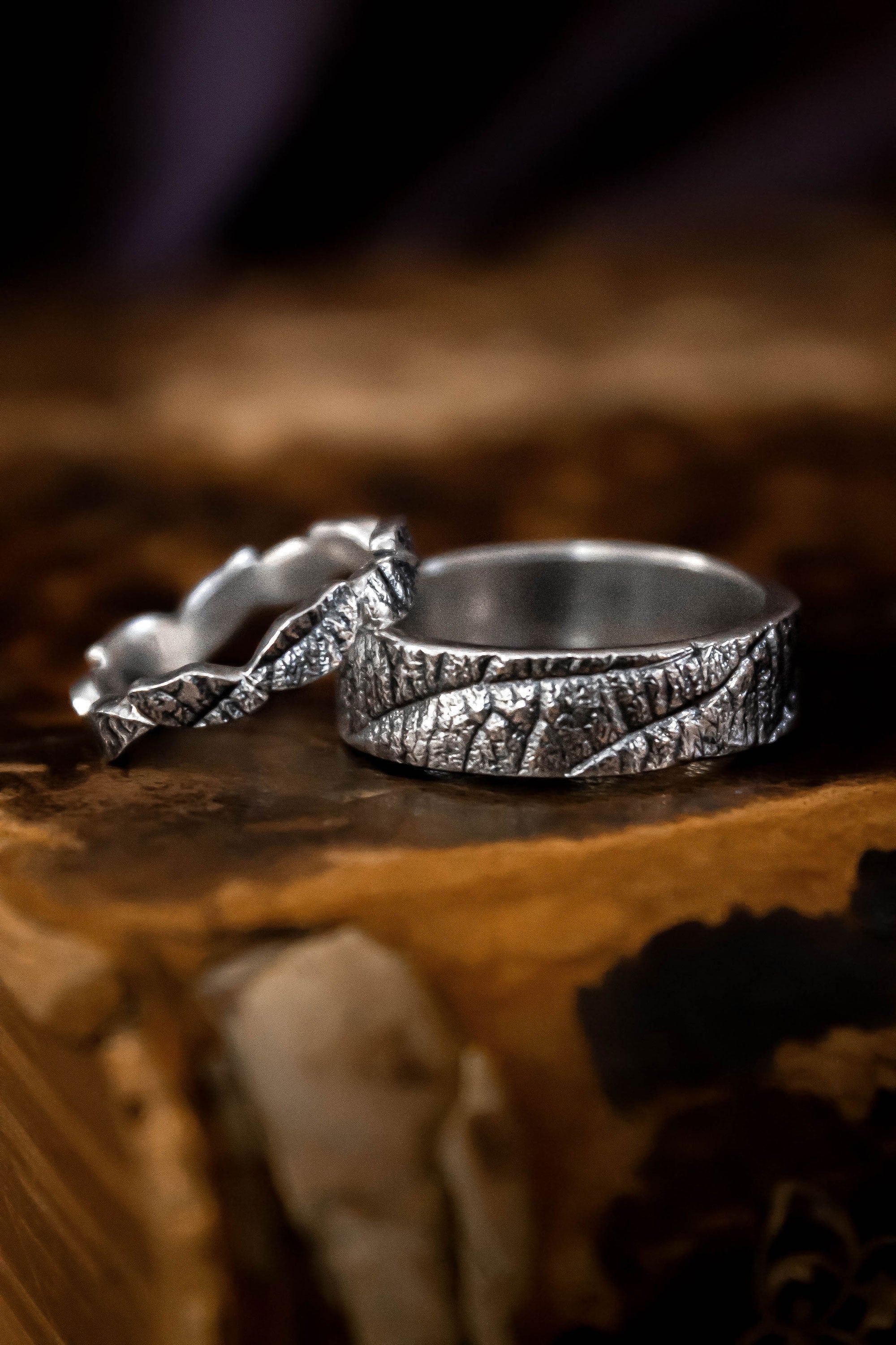 Argollas personalizadas con textura de hoja de Lantana real, hechas en plata 950. Los novios querían rescatar las vetas naturales de una hoja. Él quería que fuera una argolla grande y ella quería que fuera más delicada. De esta forma, resolvimos en conjunto mantener en ambas argollas la misma textura, pero el anillo femenino calarlo en forma de hojitas pequeñas.