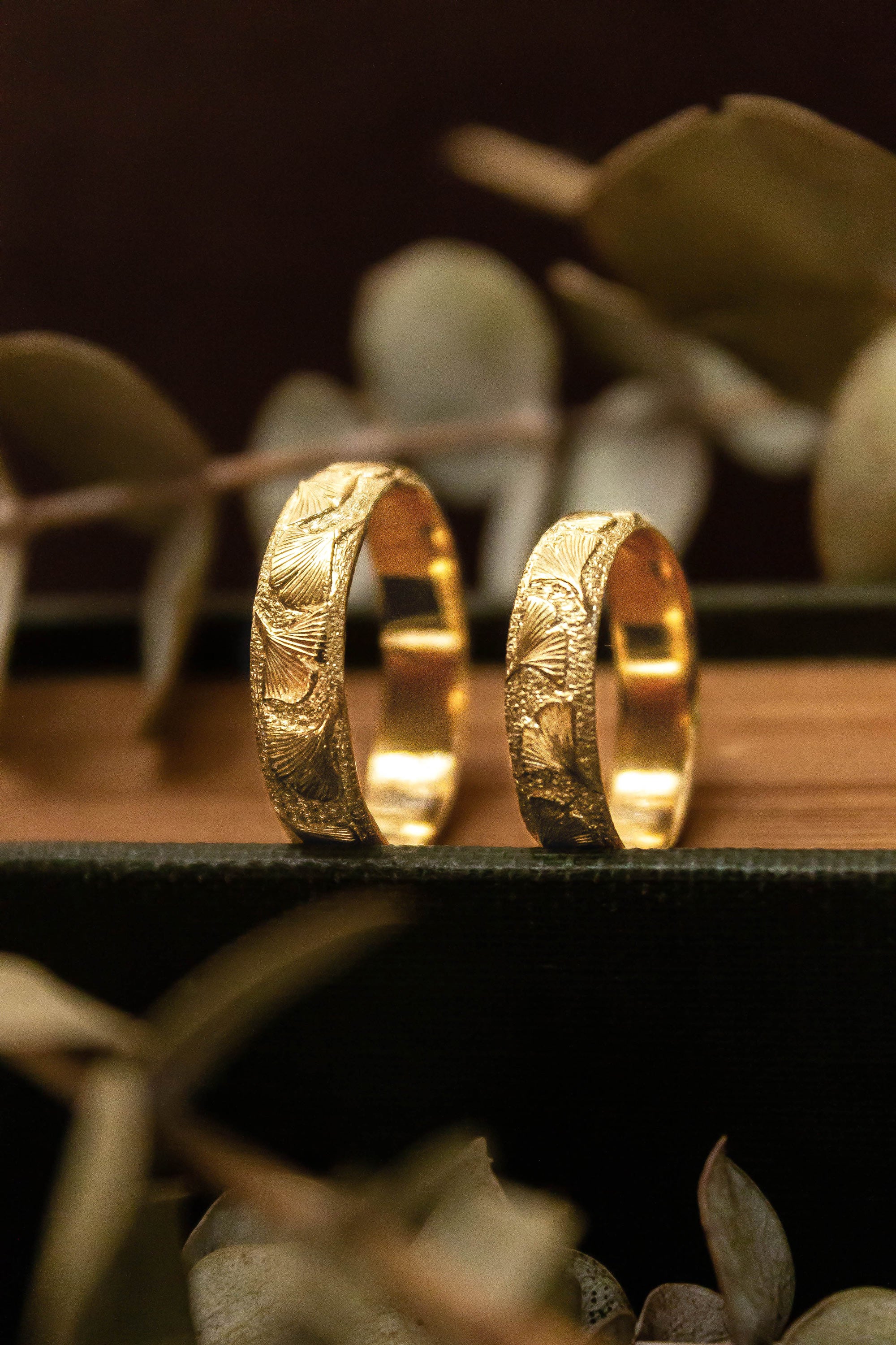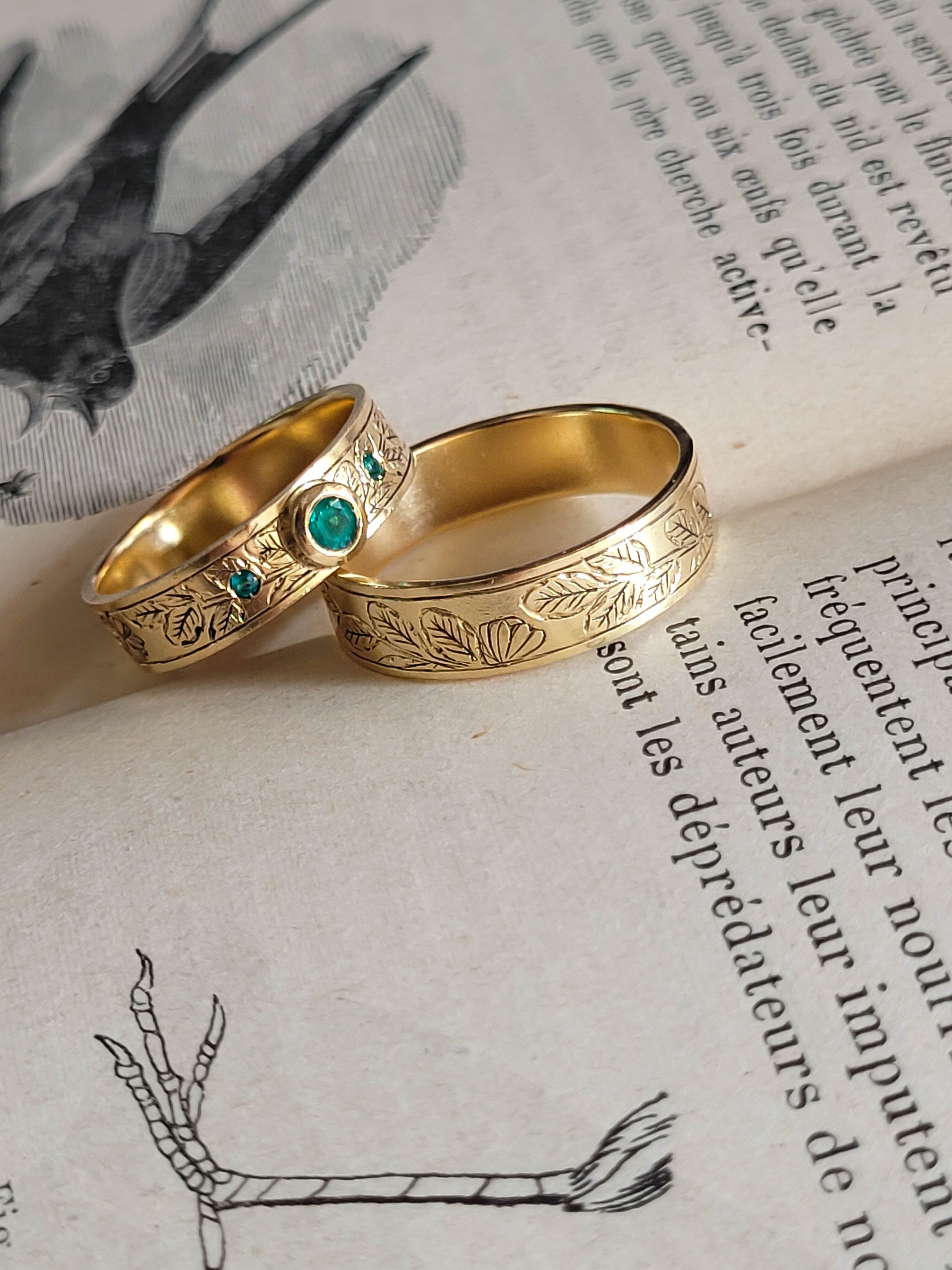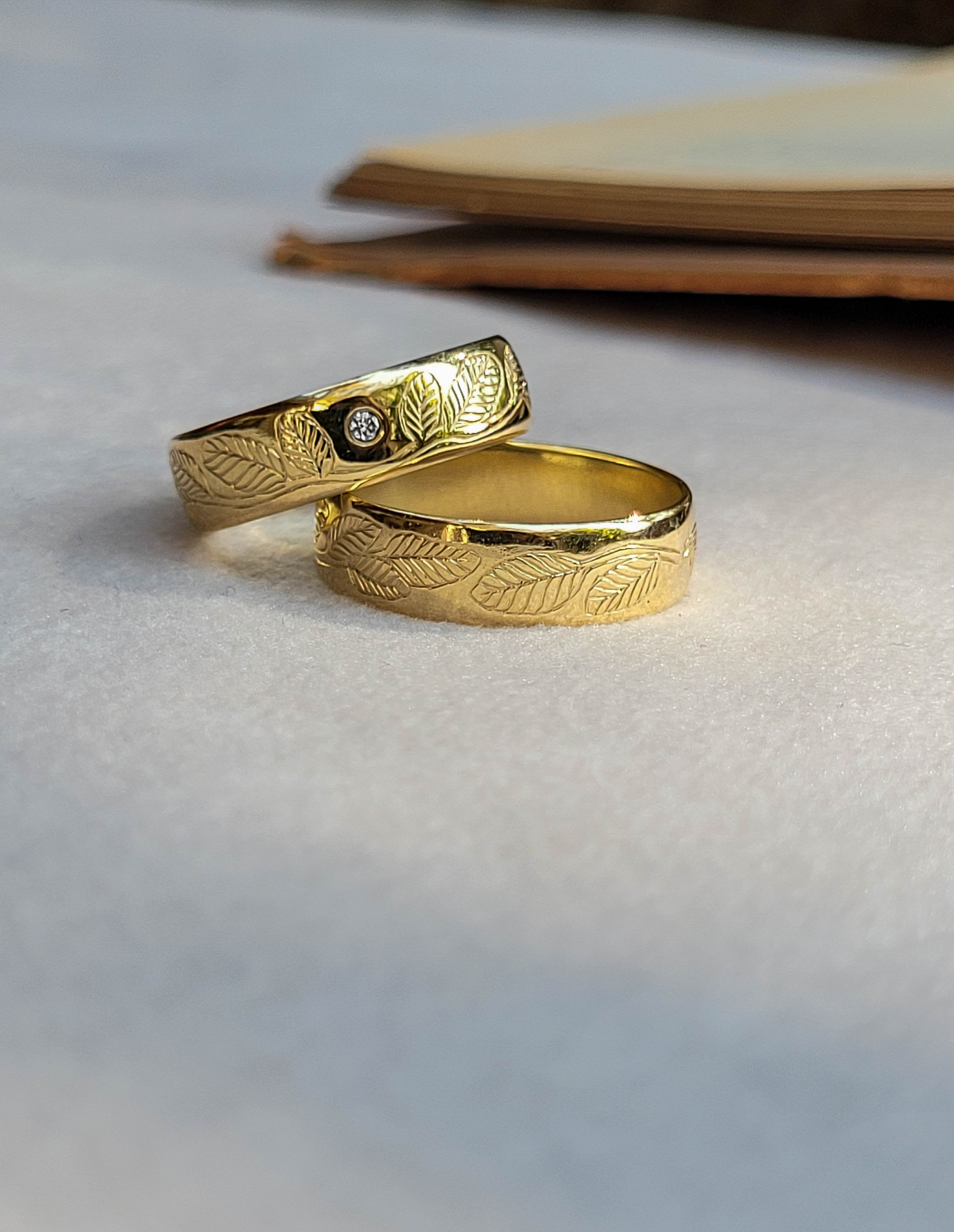 Argollas de matrimonio con motivos botánicos, hechas con la técnica de grabado de bajo relieve que produce dos planos en el dibujo, resaltando las hojas y dejando el fondo más bajo con su textura.