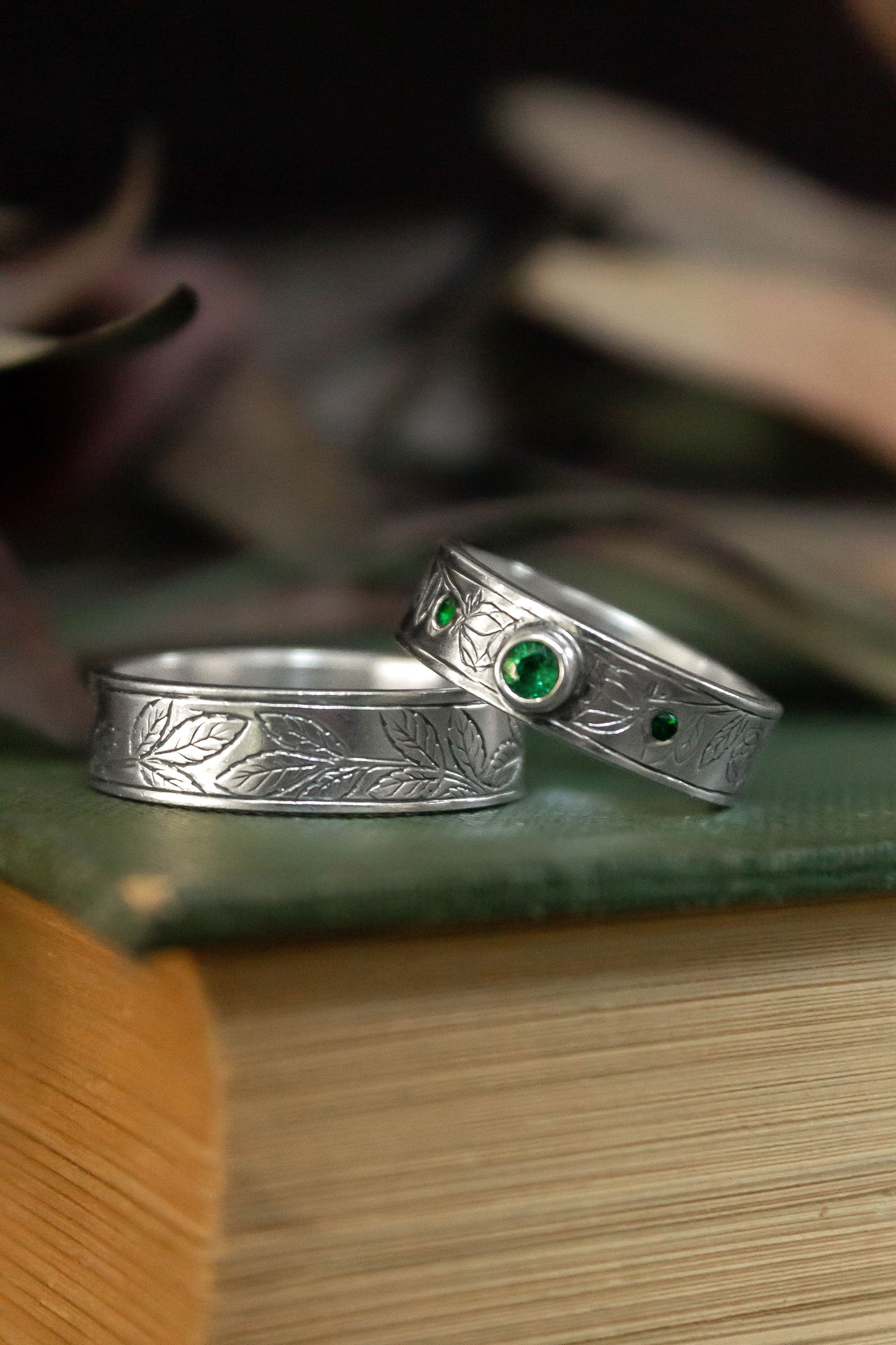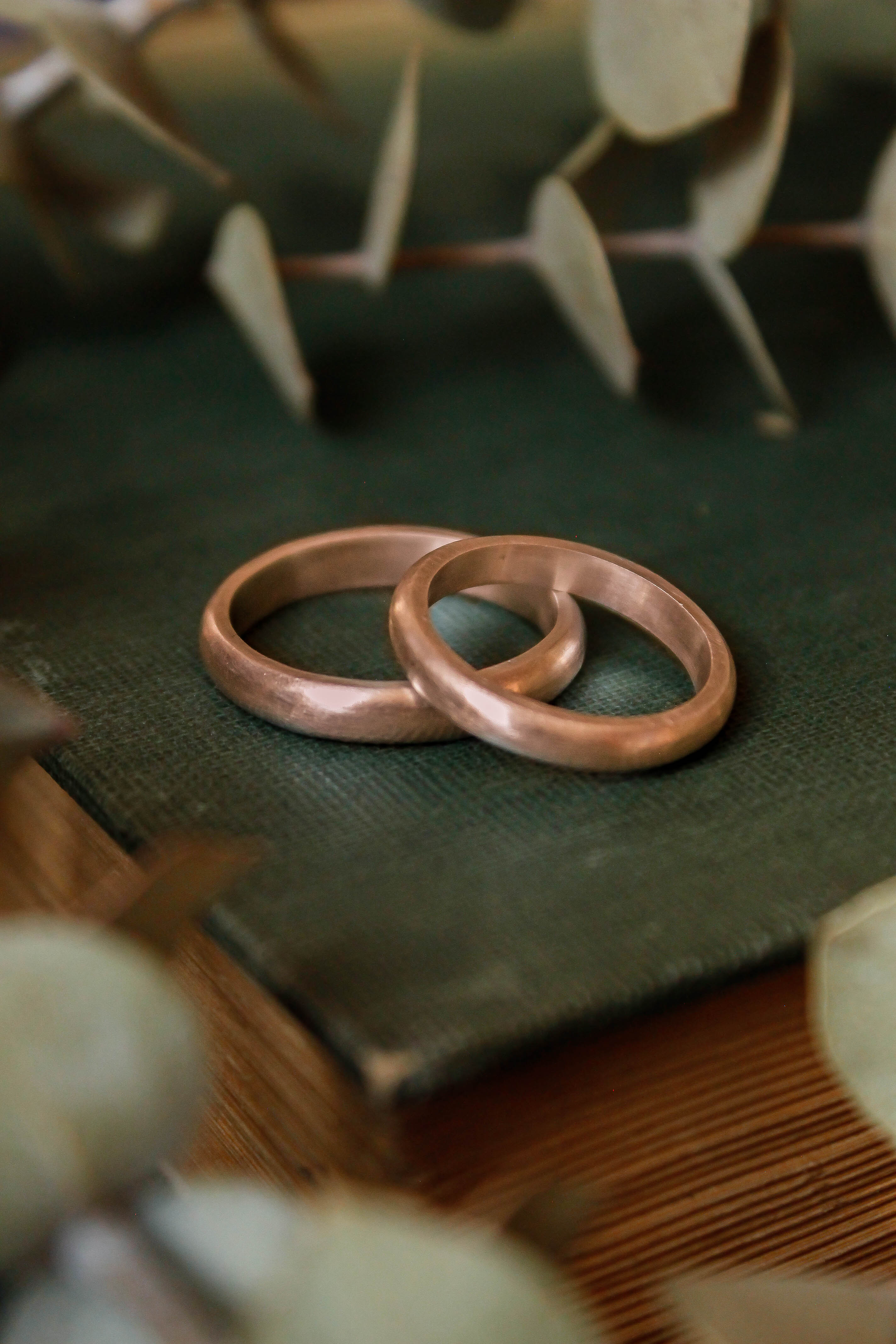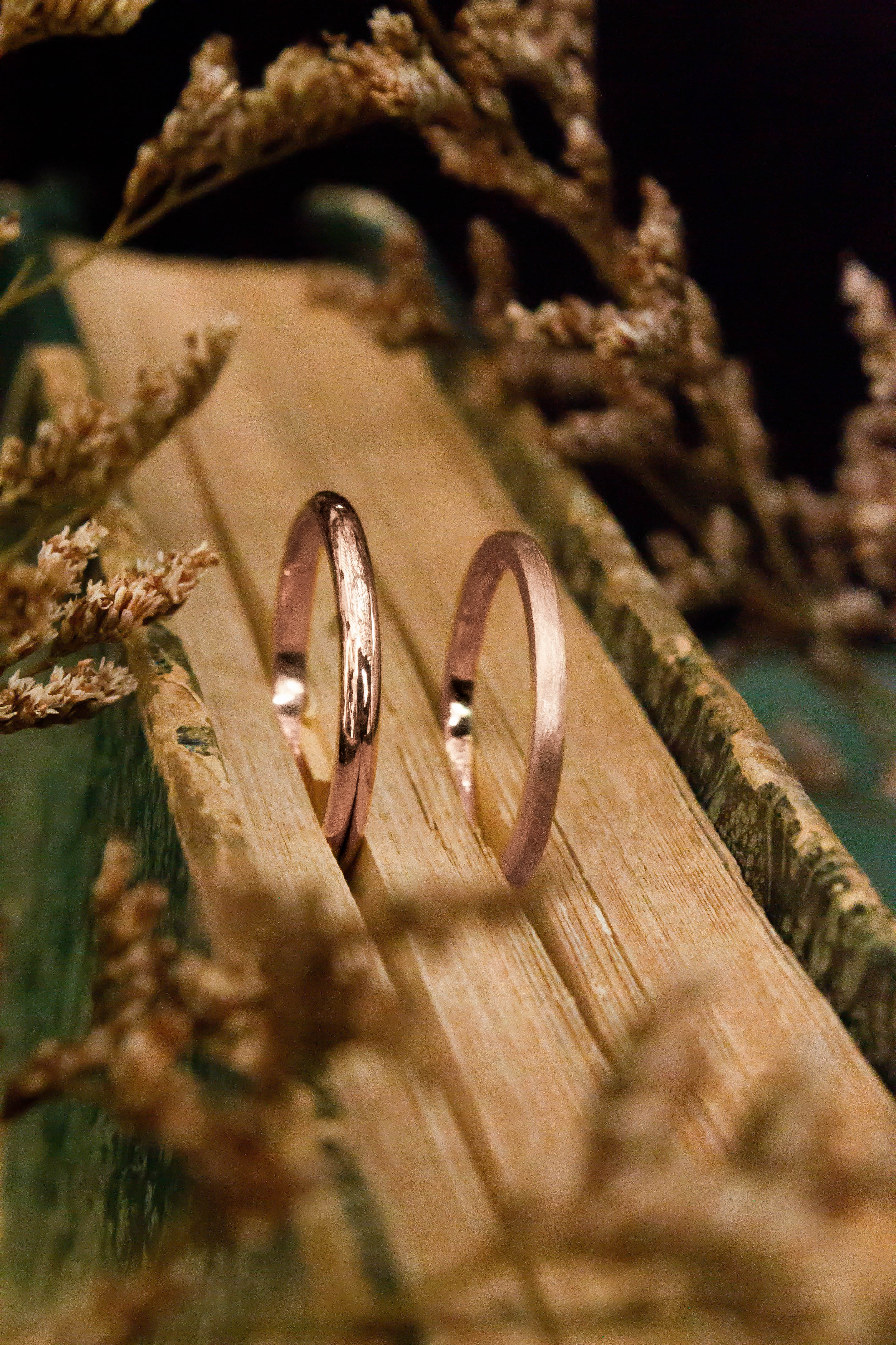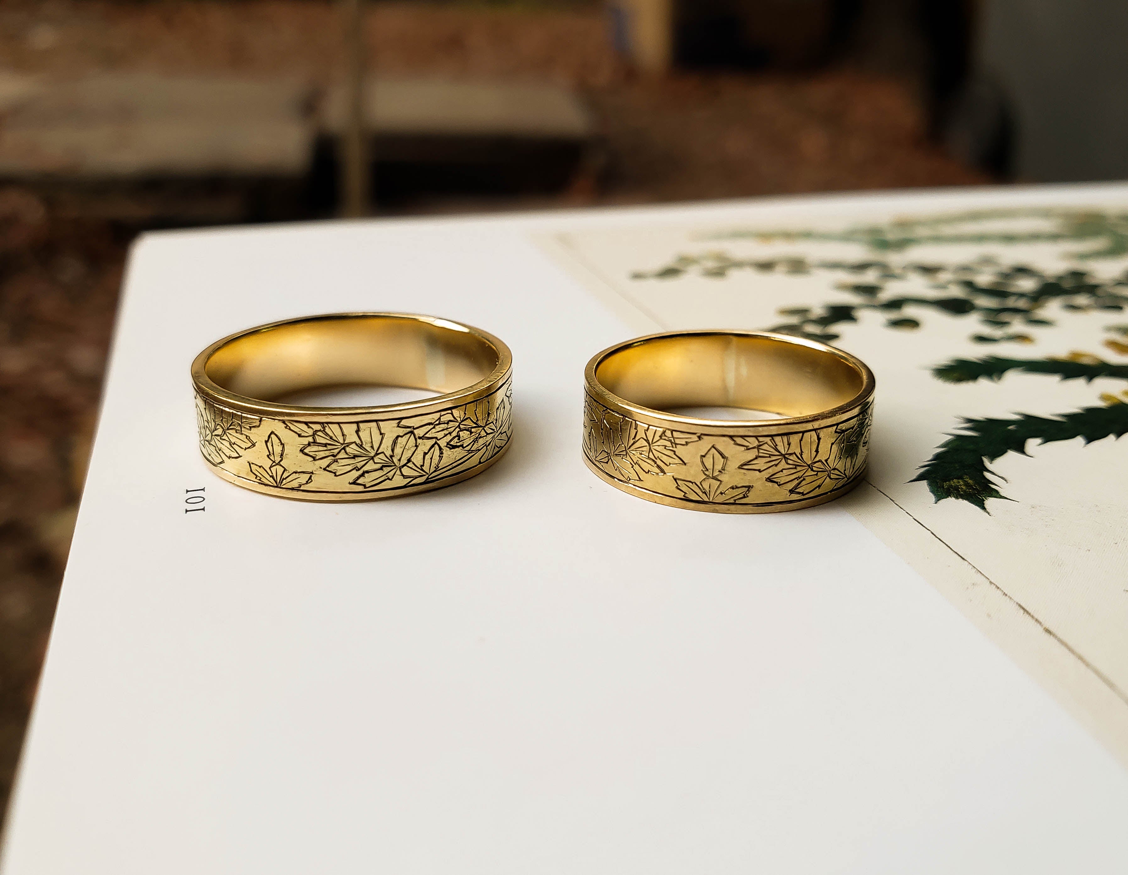 Argollas de matrimonio con motivos botánicos, hechas con la técnica de grabado de bajo relieve que produce dos planos en el dibujo, resaltando las hojas y dejando el fondo más bajo con su textura.