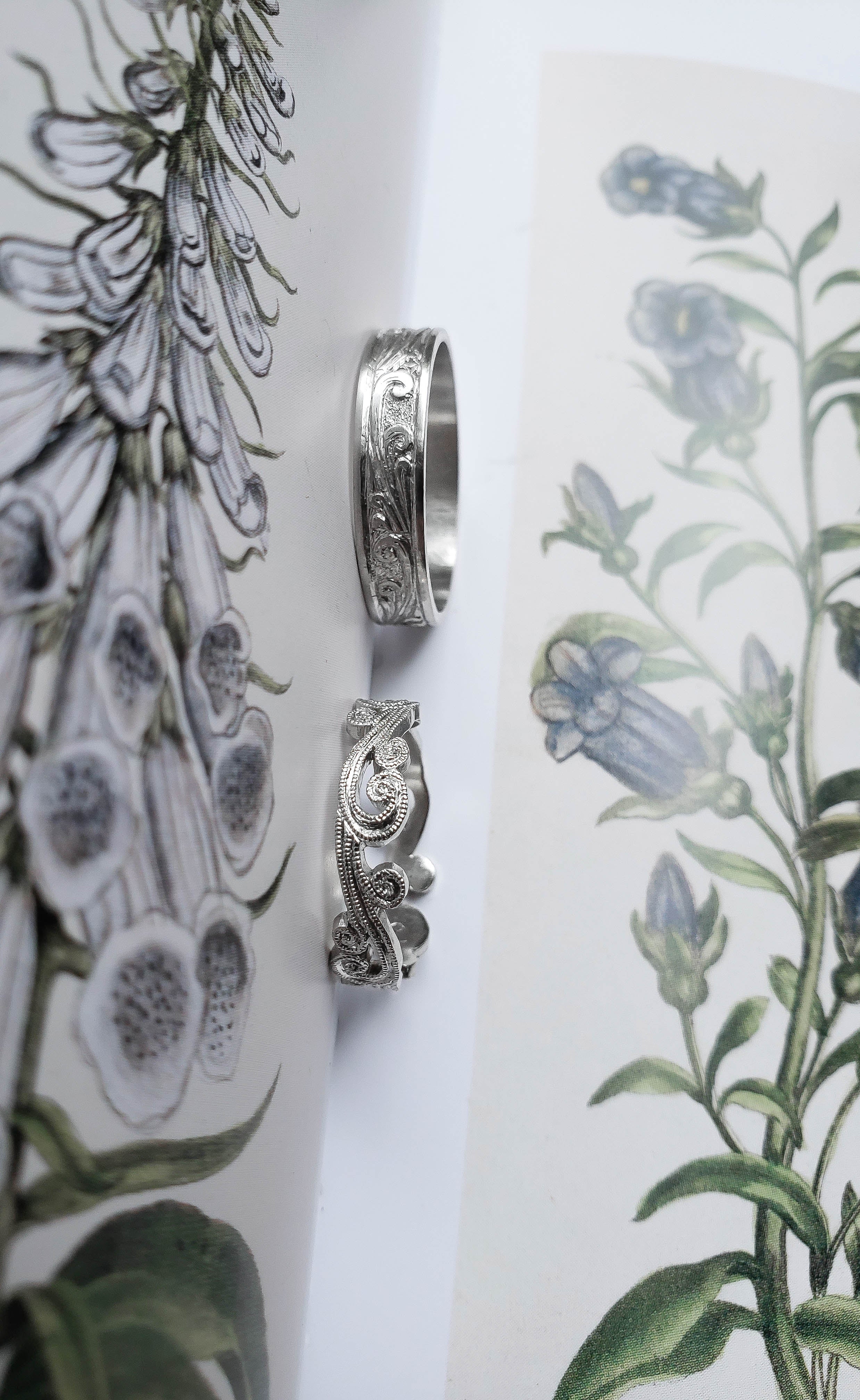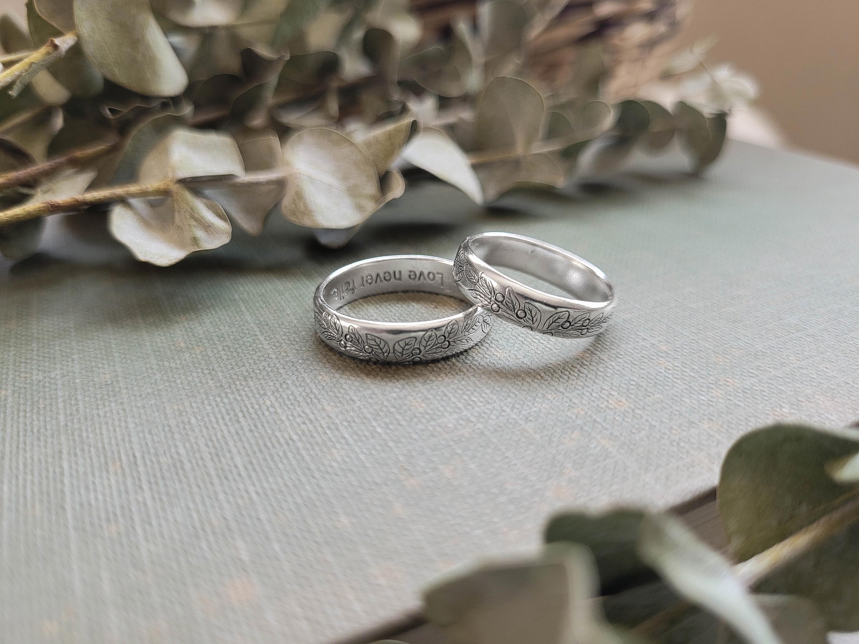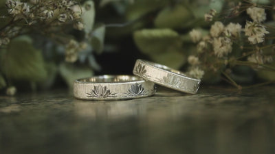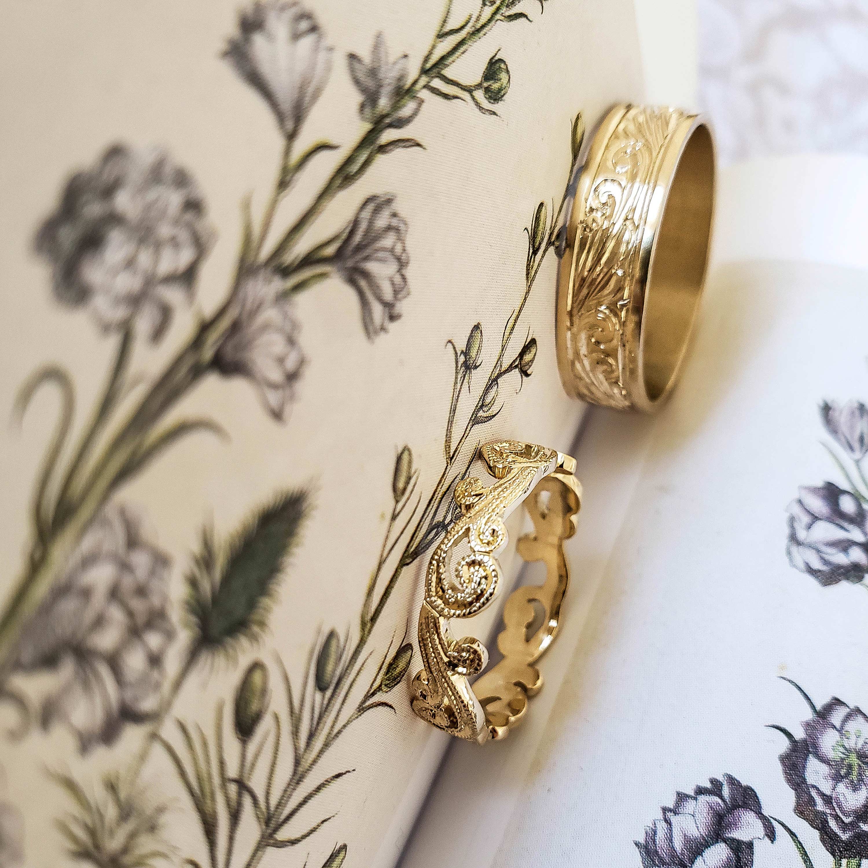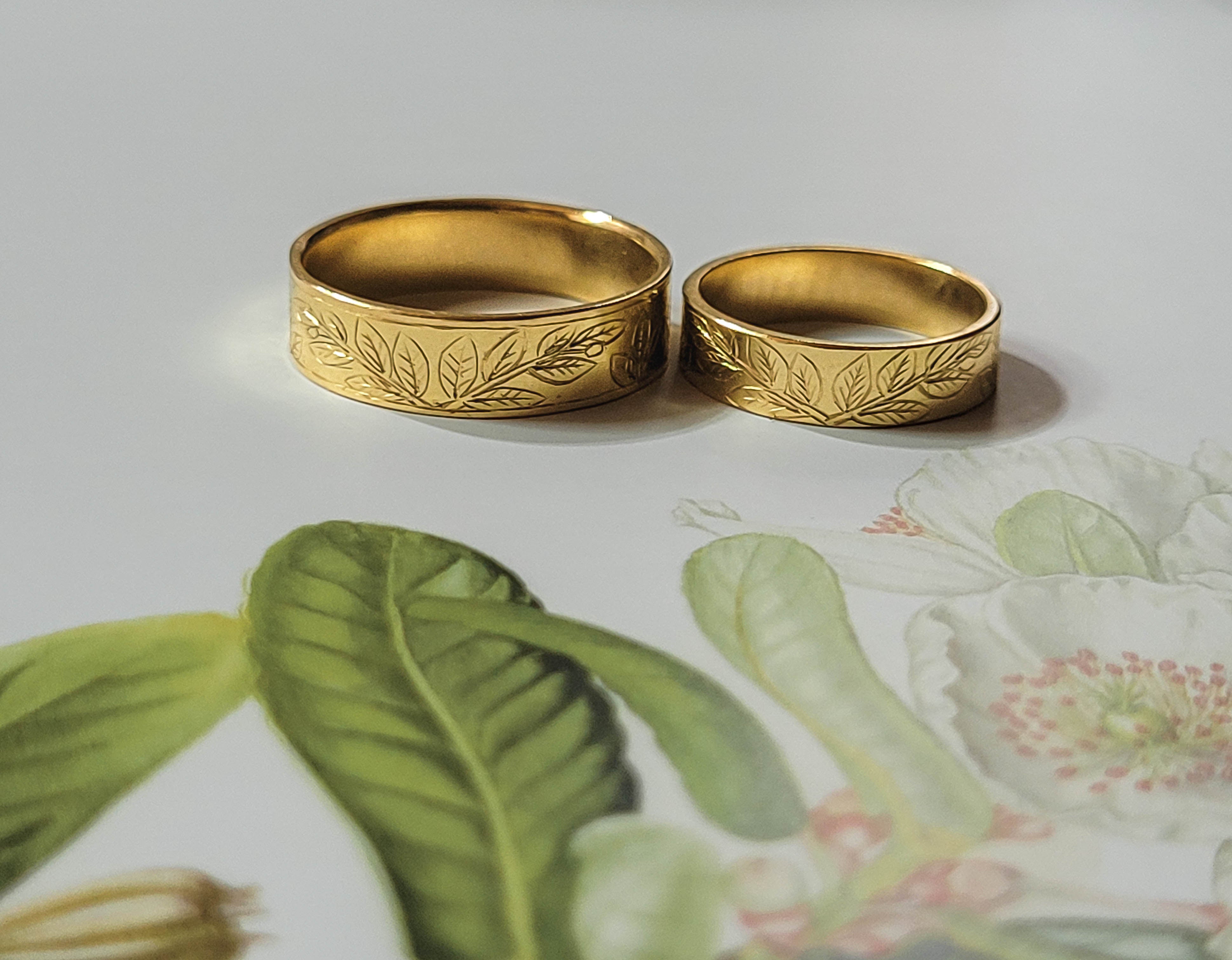 Argollas de matrimonio con motivos botánicos, hechas con la técnica de grabado sin bajo relieve, donde se dibuja solo el trazo del dibujo en unas argollas de corte recto o redondeado.