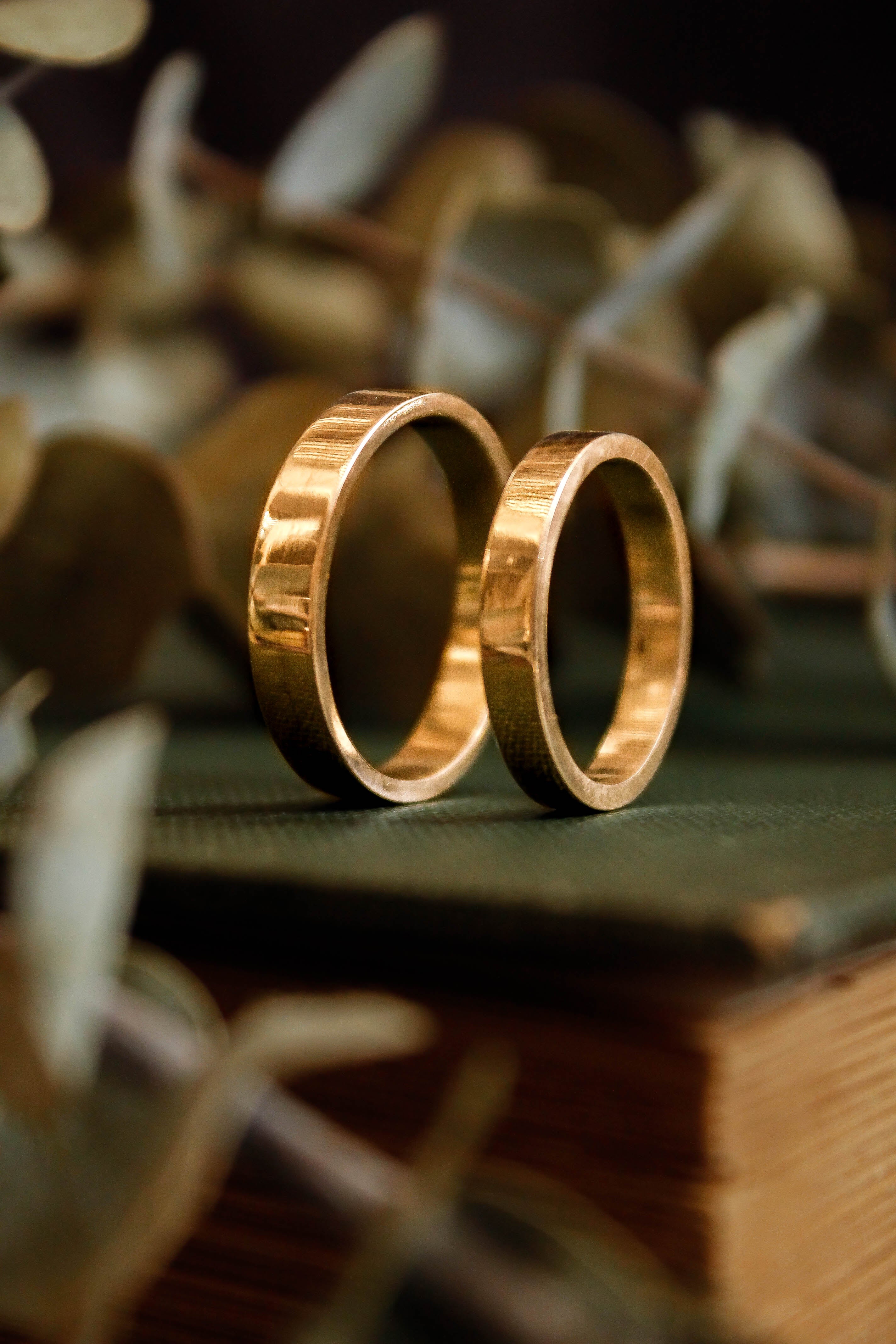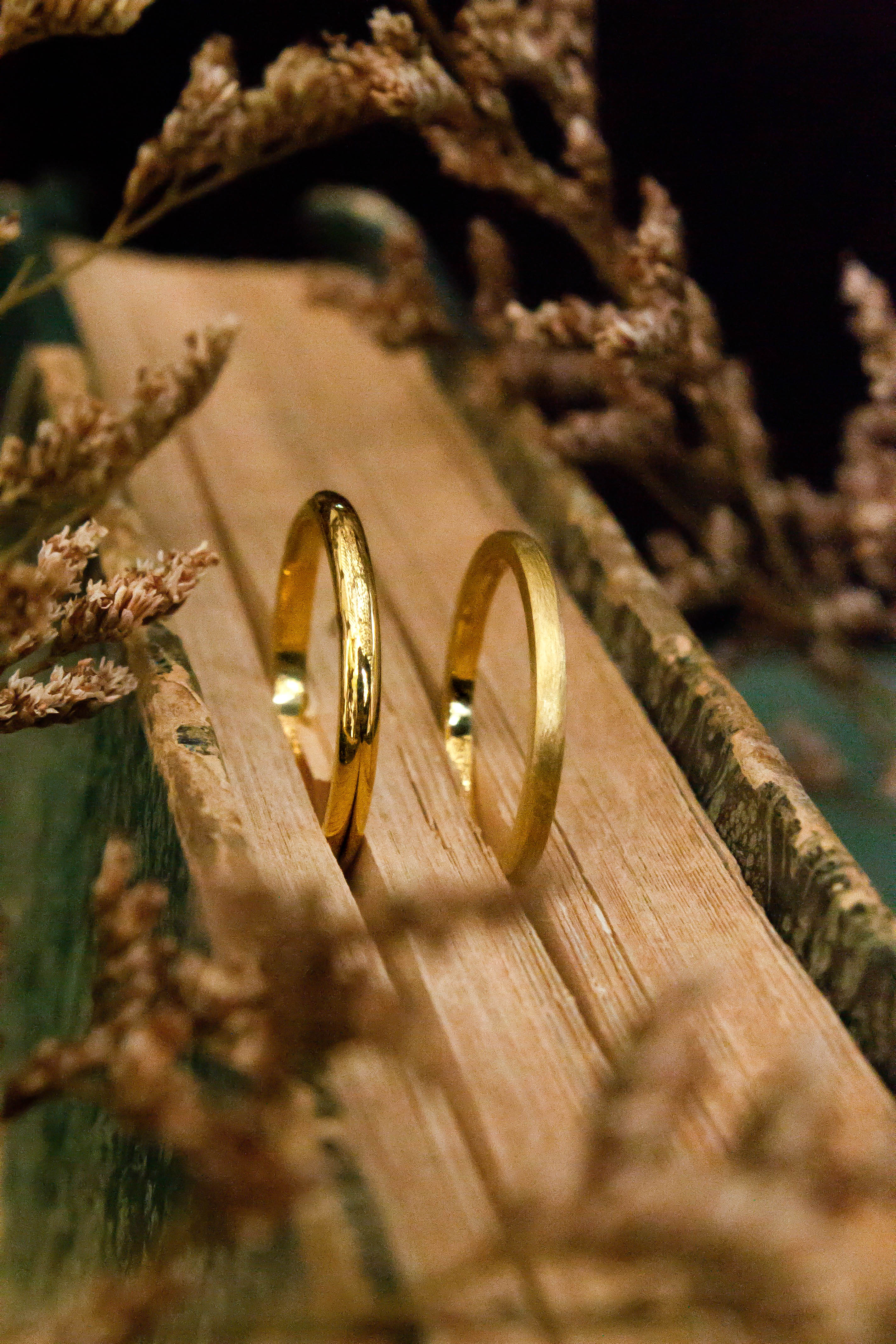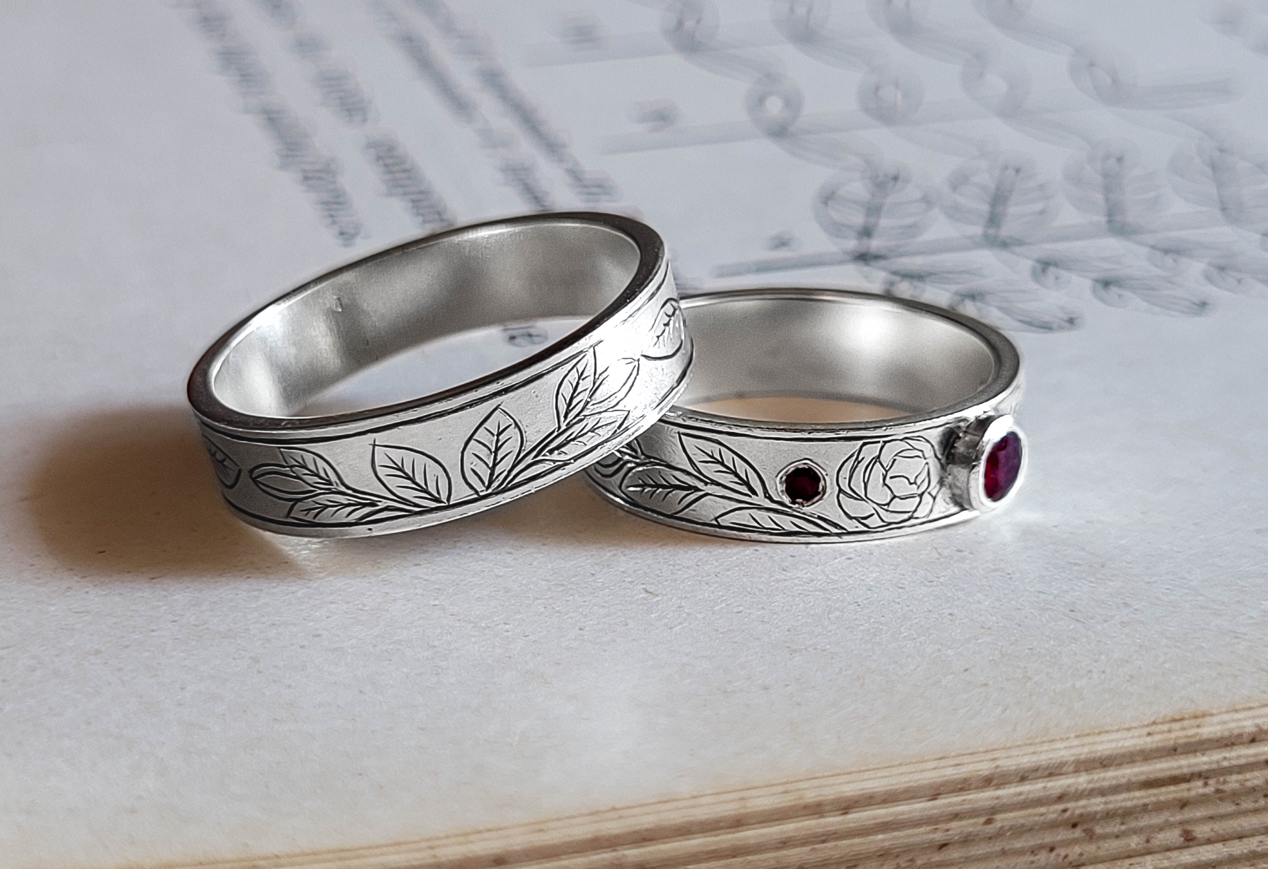 Argollas de matrimonio con motivos botánicos, hechas con la técnica de grabado sin bajo relieve, donde se dibuja solo el trazo del dibujo en unas argollas de corte recto o redondeado.