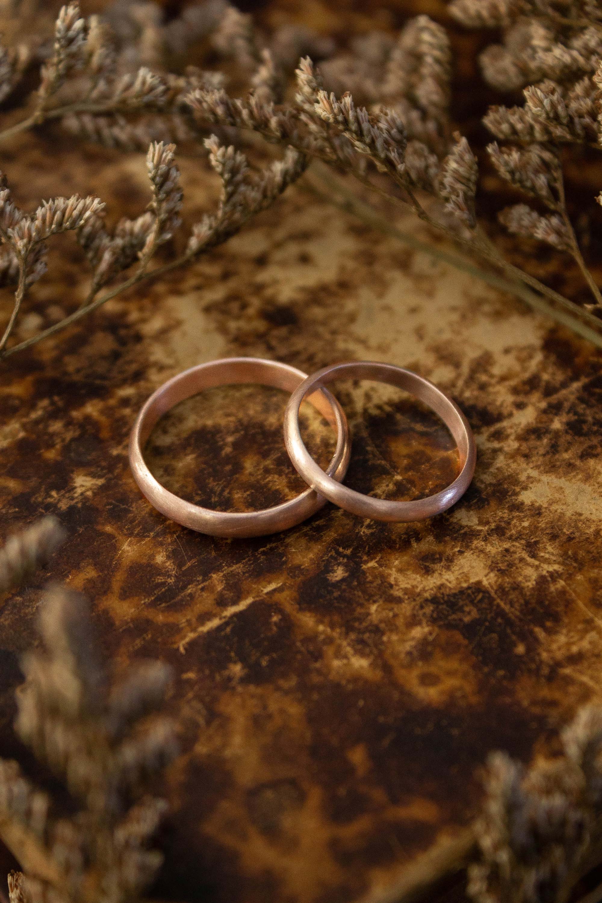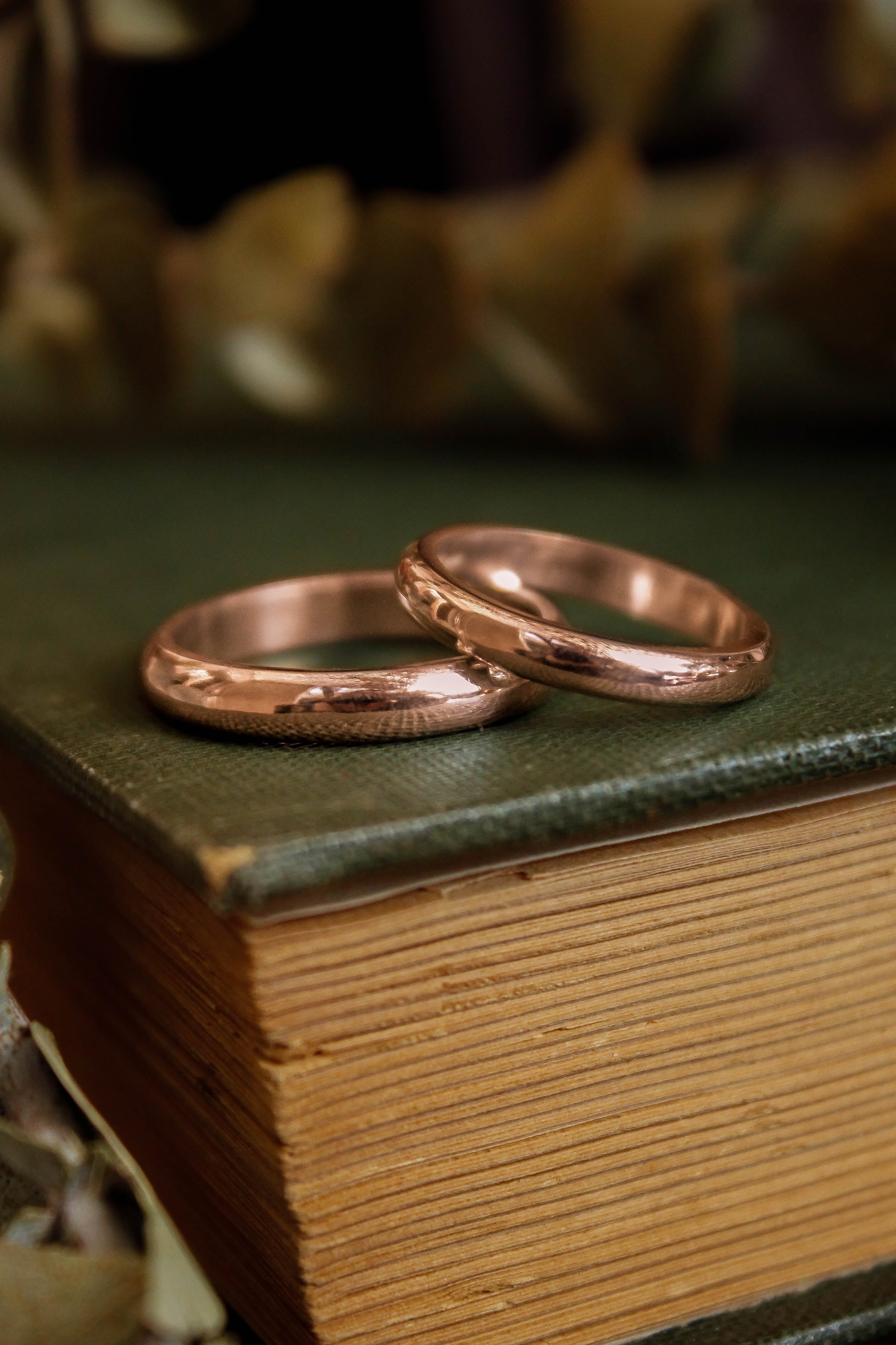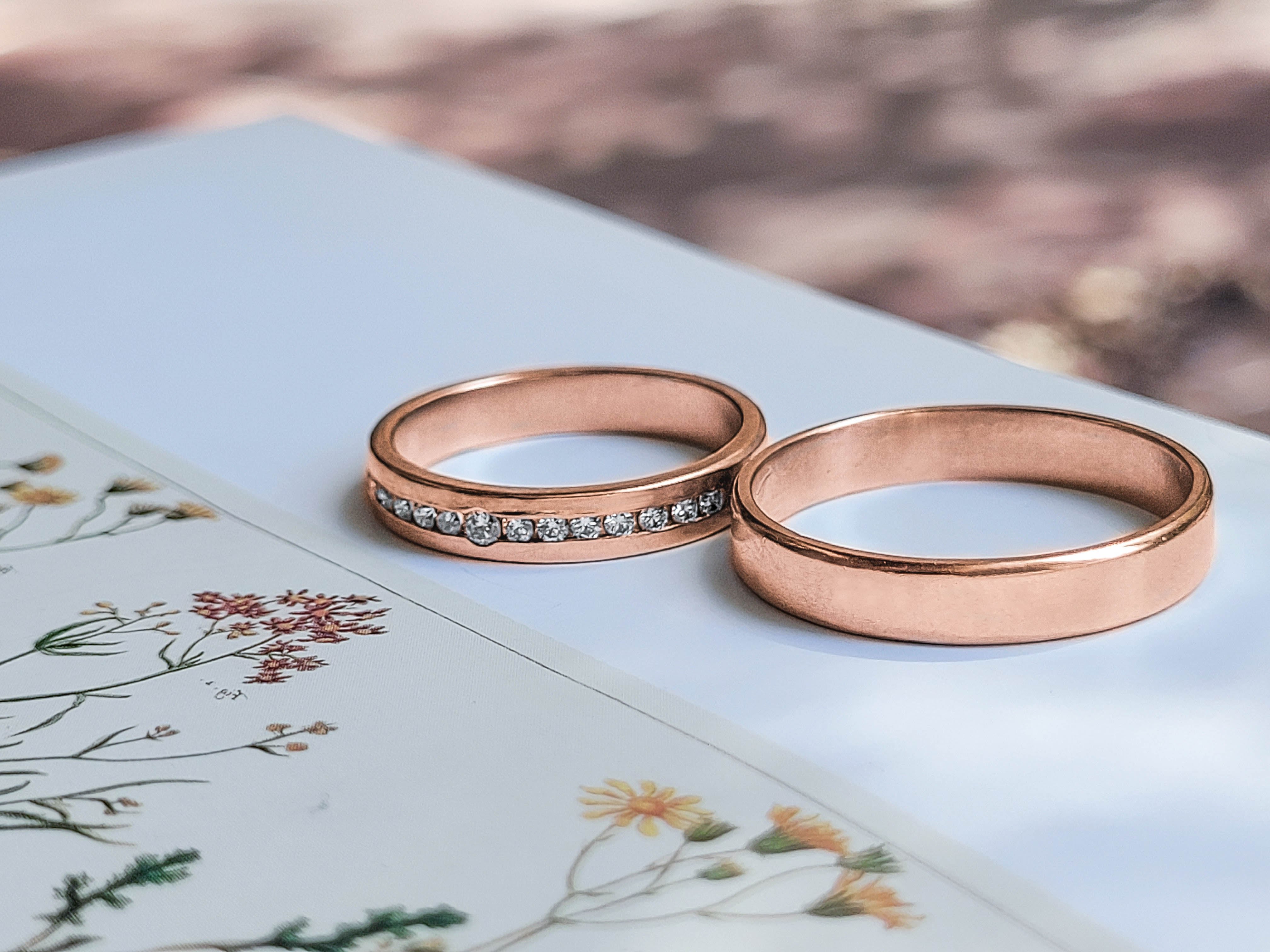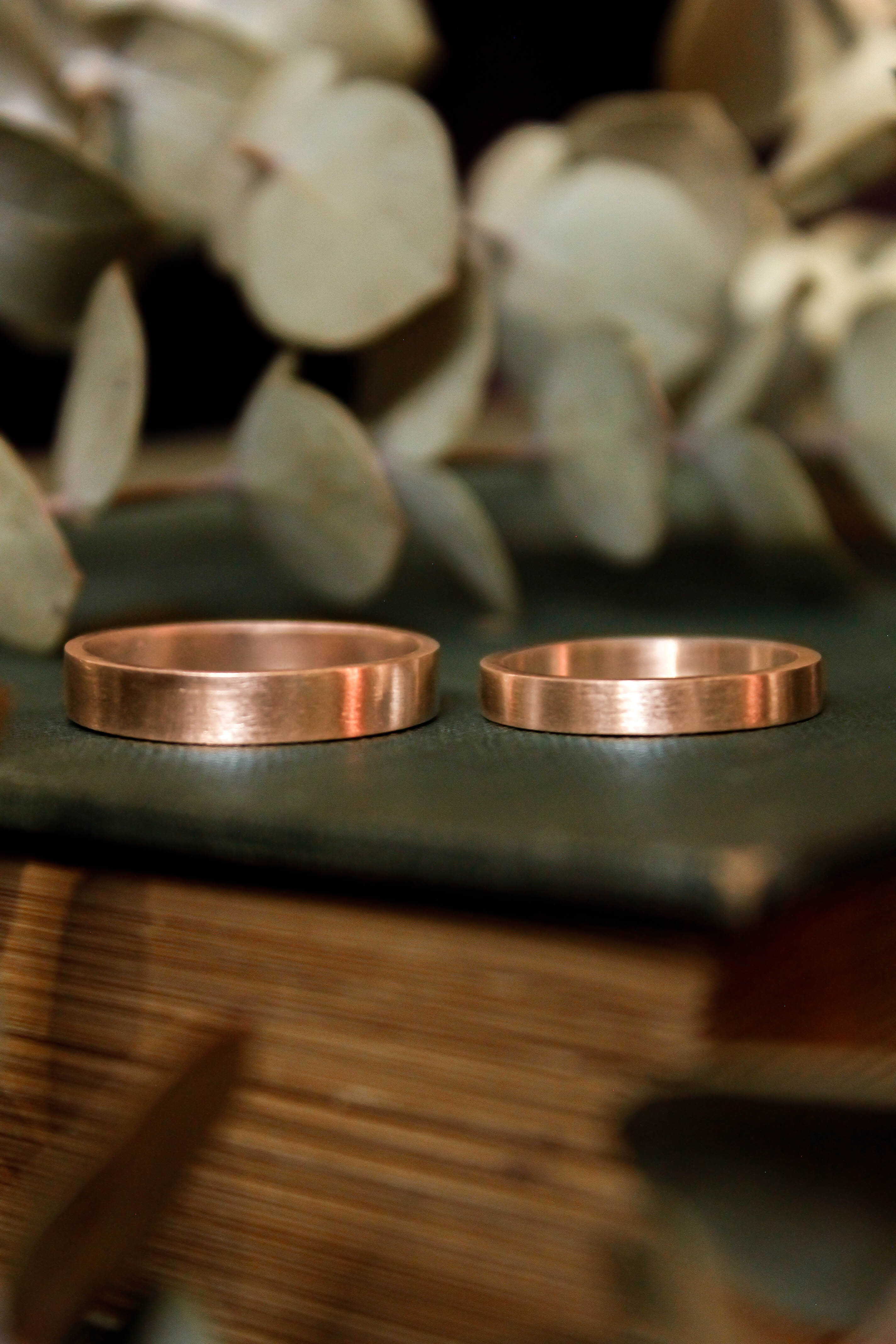 Argollas de matrimonio con motivos botánicos, hechas con la técnica de grabado sin bajo relieve, donde se dibuja solo el trazo del dibujo en unas argollas de corte recto o redondeado.