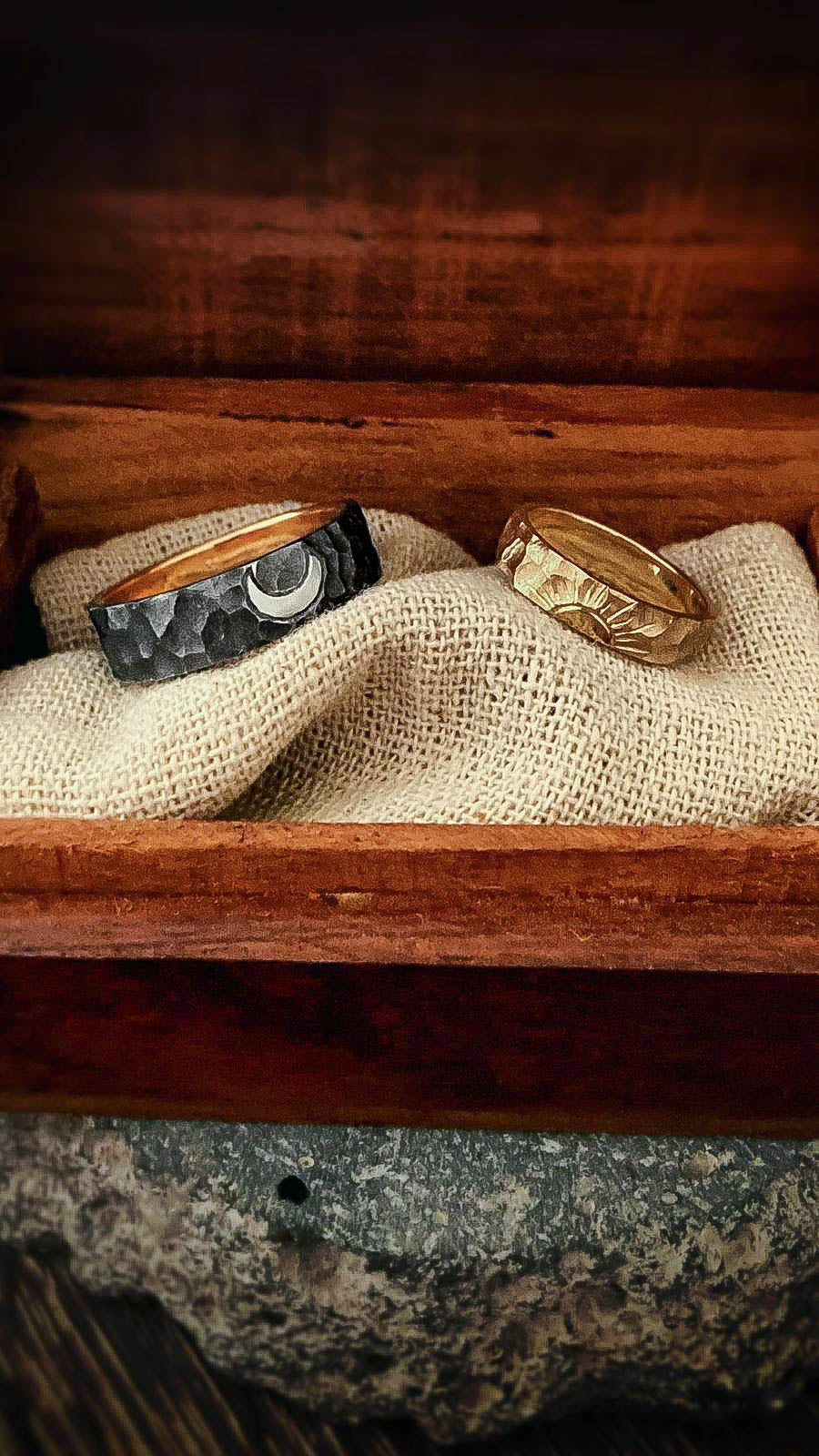 Argollas personalizadas con motivos de sol y luna, hechas en oro rosa, sol y luna grabadas. La argolla masculina está cubierta de plata para poder alcanzar el tono negro y el contraste, pero por dentro sigue siendo oro rosa.