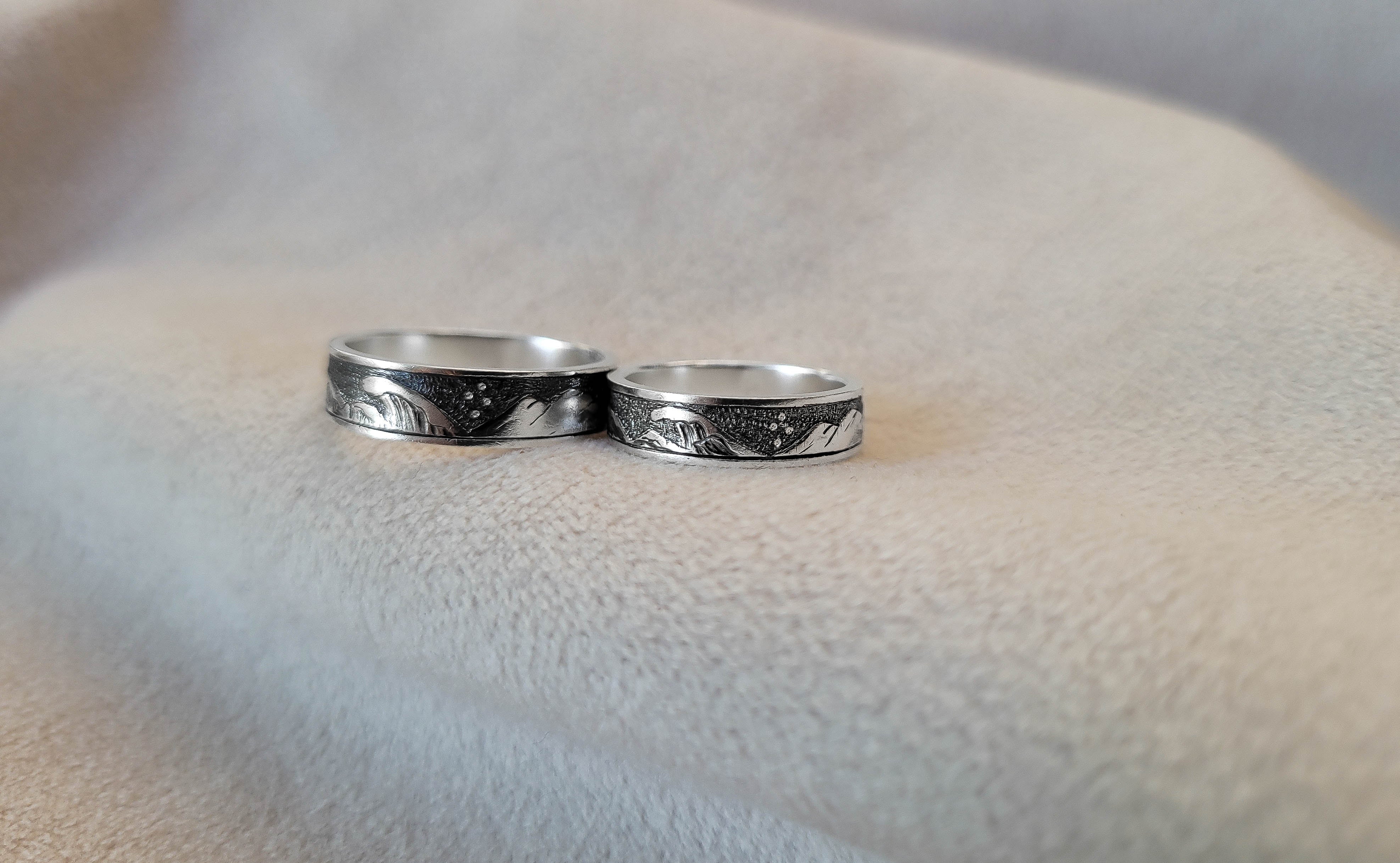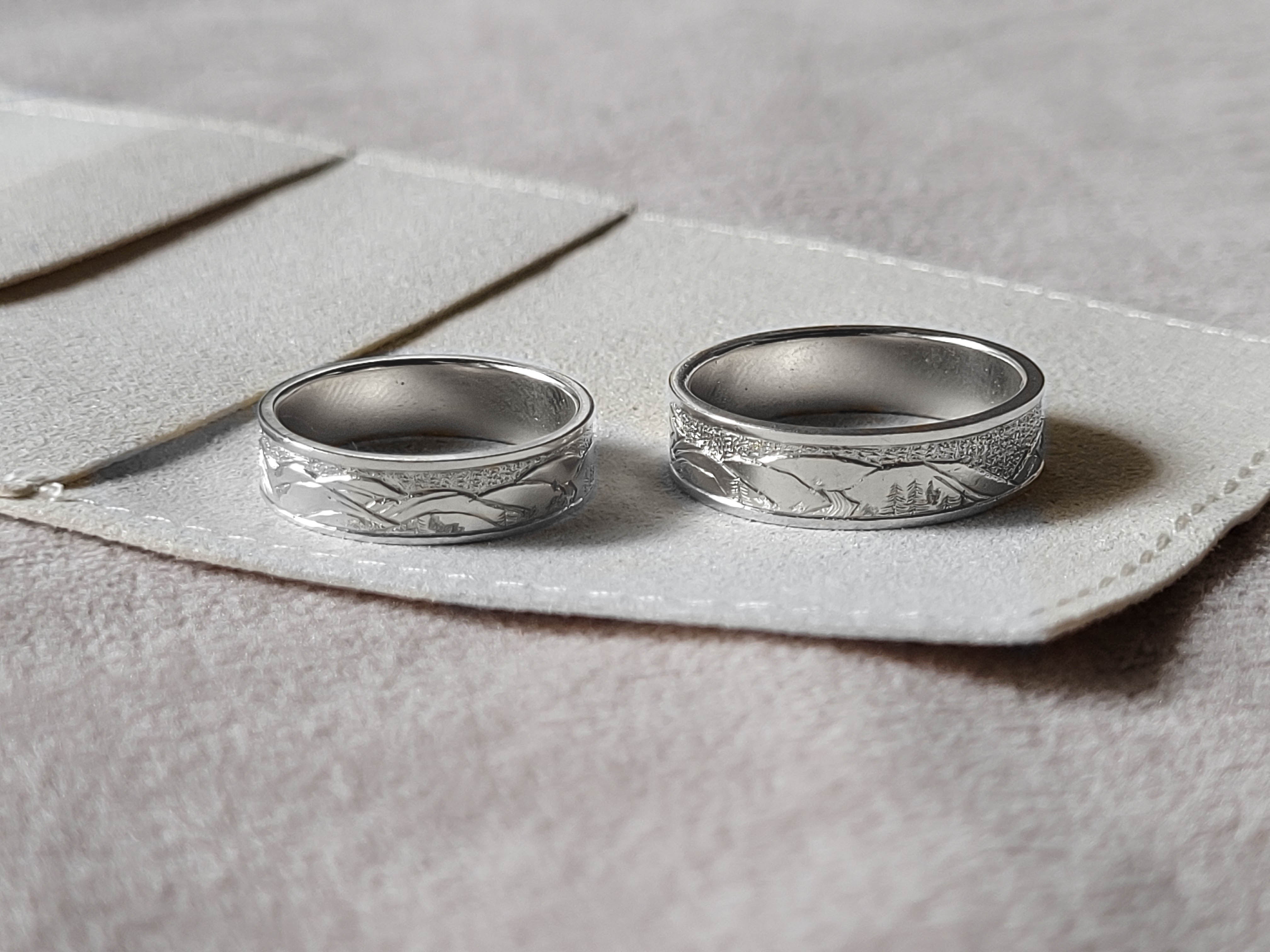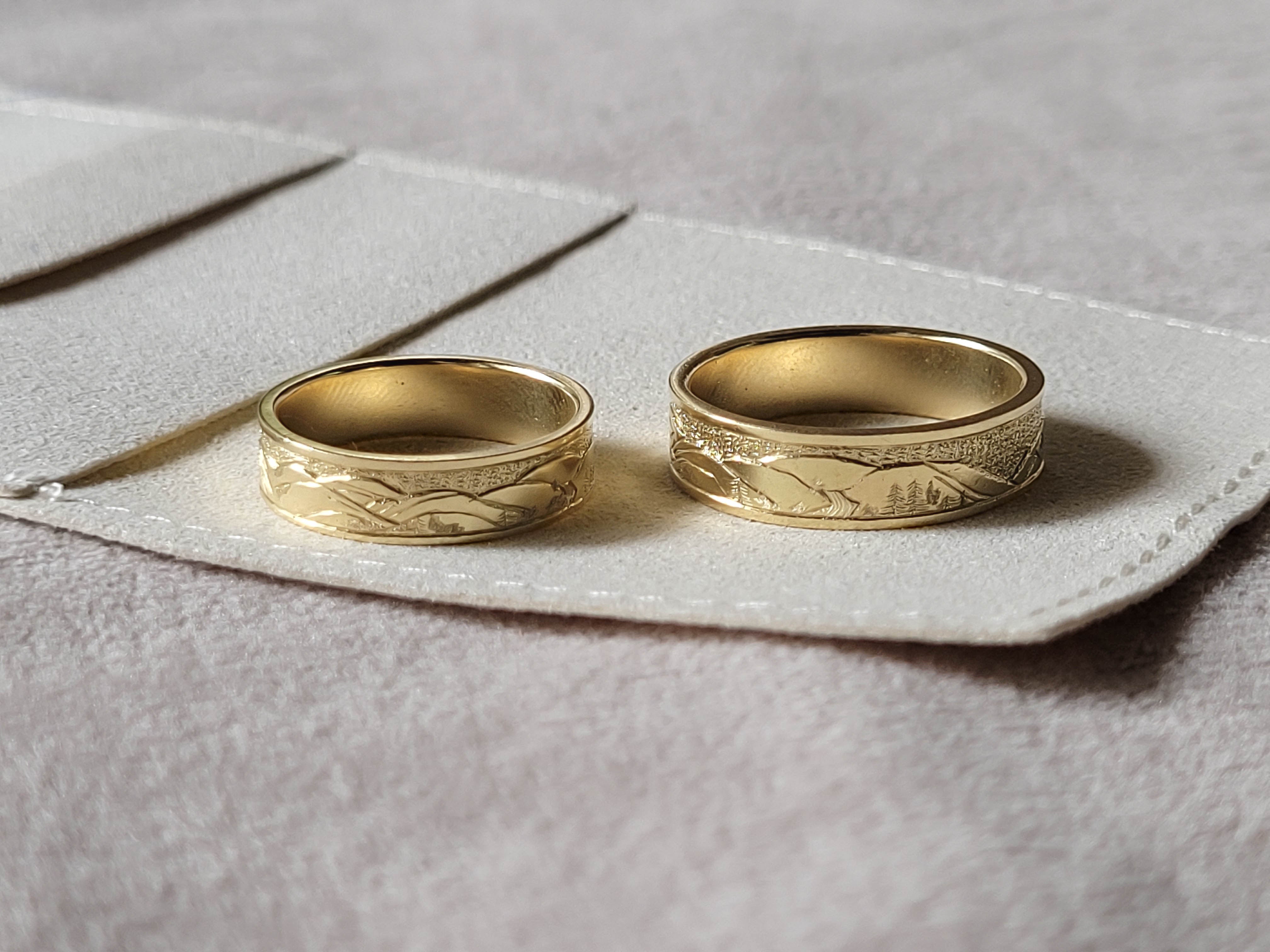 Argollas de matrimonio con dibujos de paisajes, hechas con la técnica de grabado de bajo relieve que produce dos planos en el dibujo, dejando las montañas o el mar en primer plano y el fondo del cielo más bajo con su textura.
