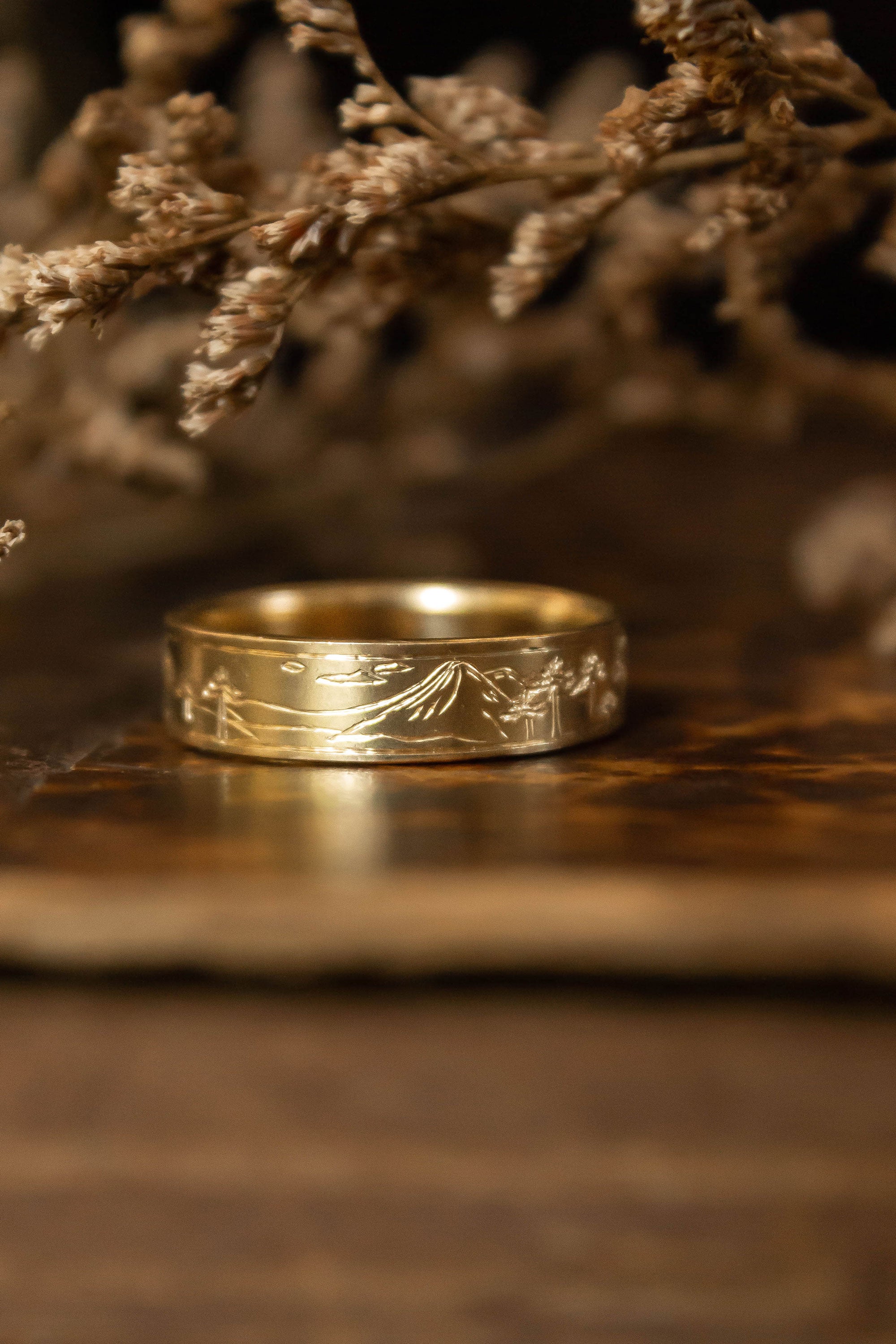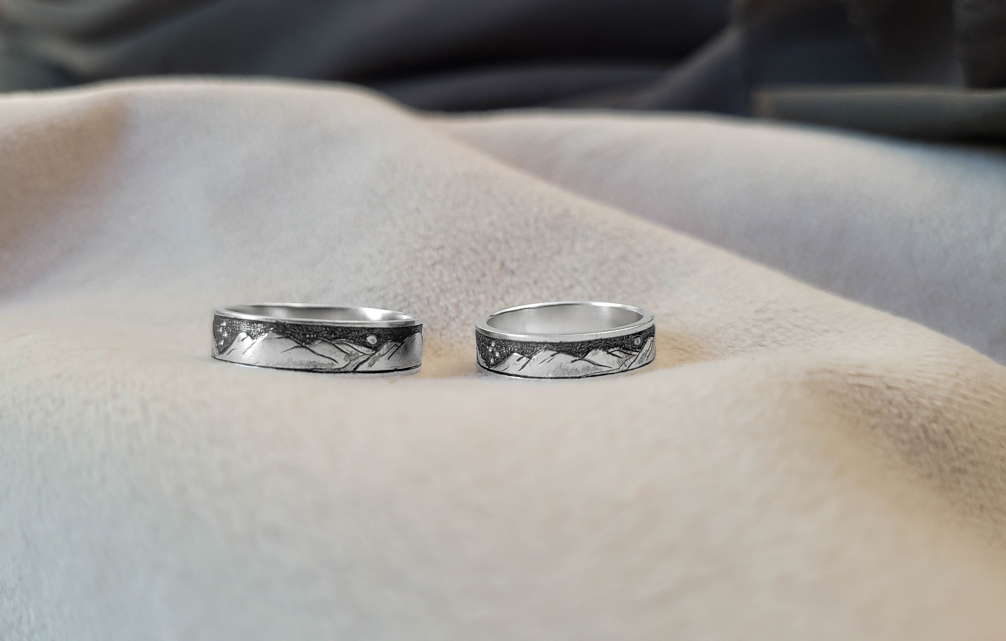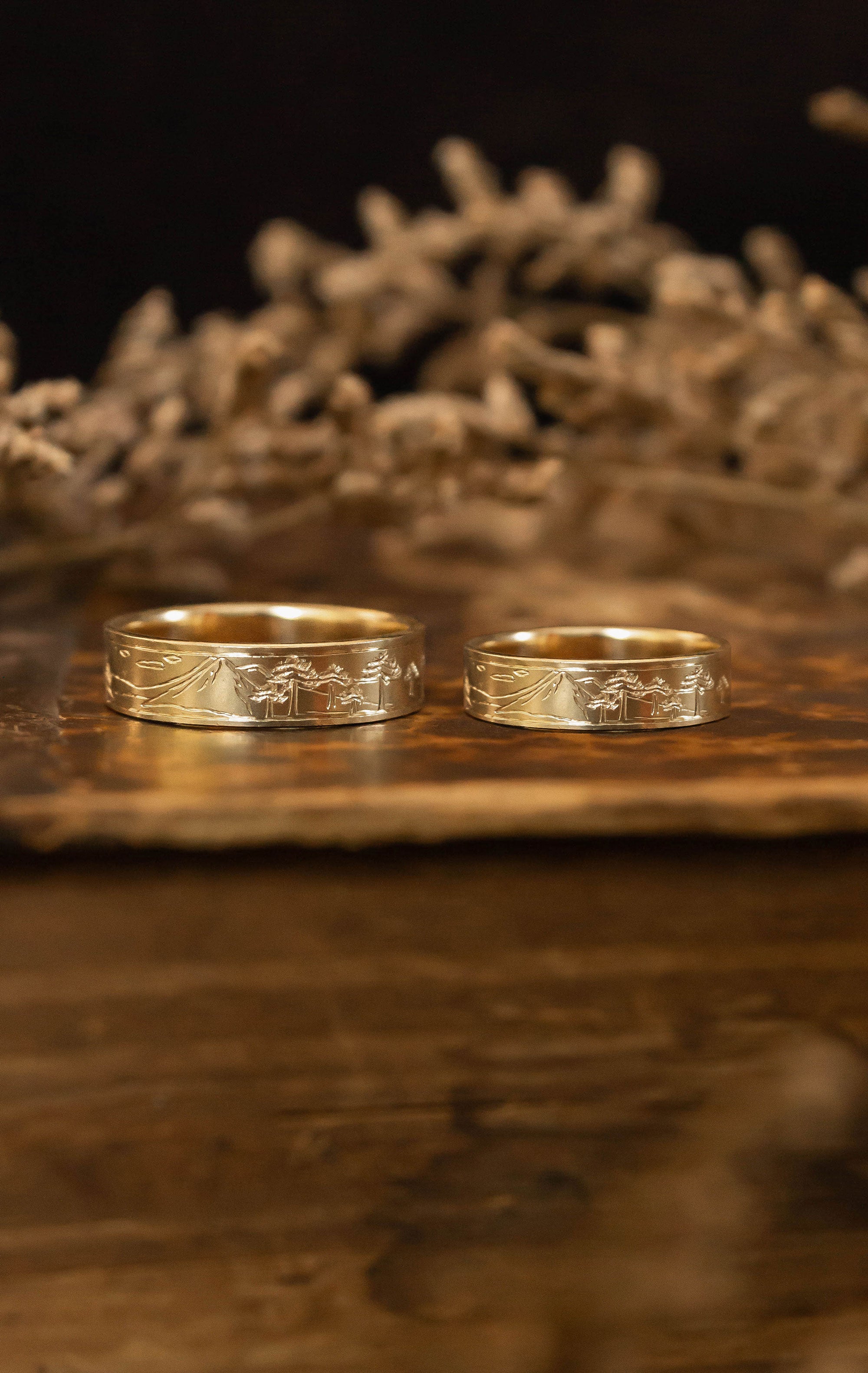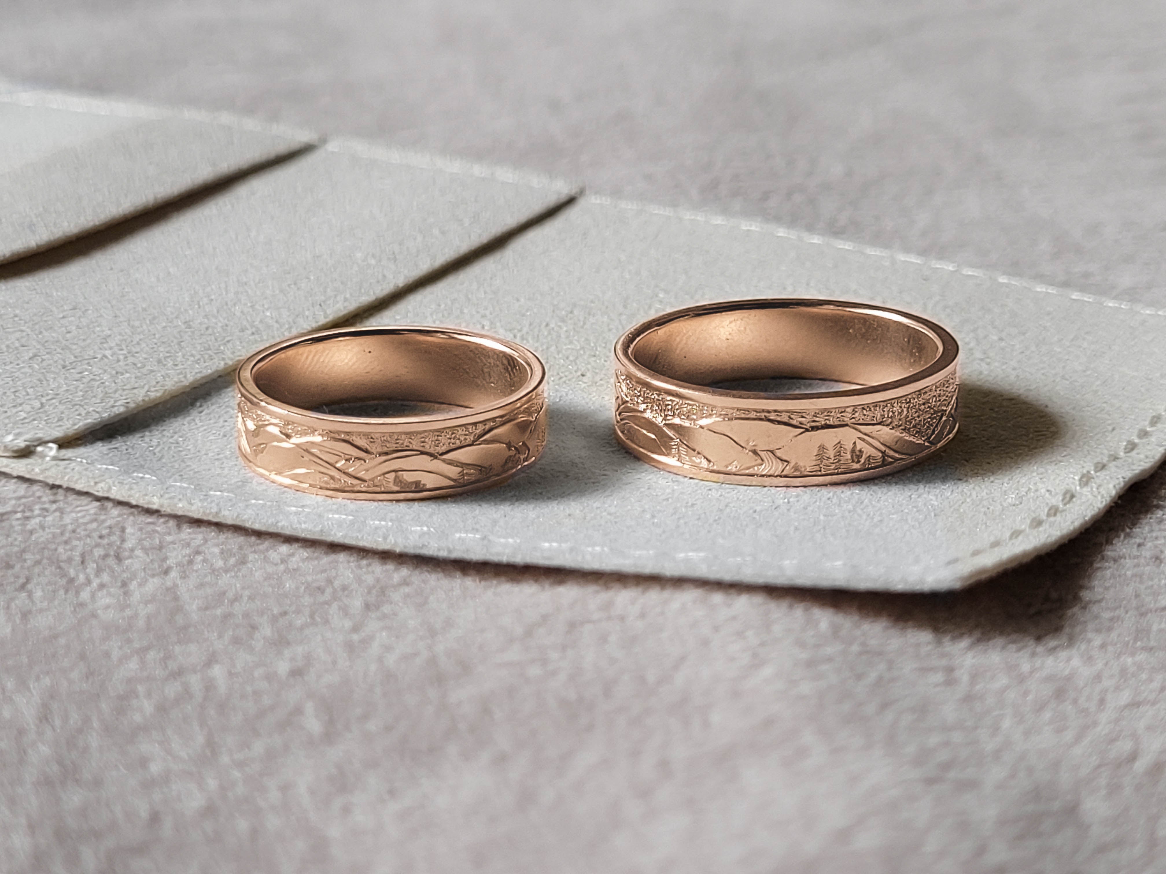 Argollas de matrimonio con dibujos de paisajes, hechas con la técnica de grabado de bajo relieve que produce dos planos en el dibujo, dejando las montañas o el mar en primer plano y el fondo del cielo más bajo con su textura.