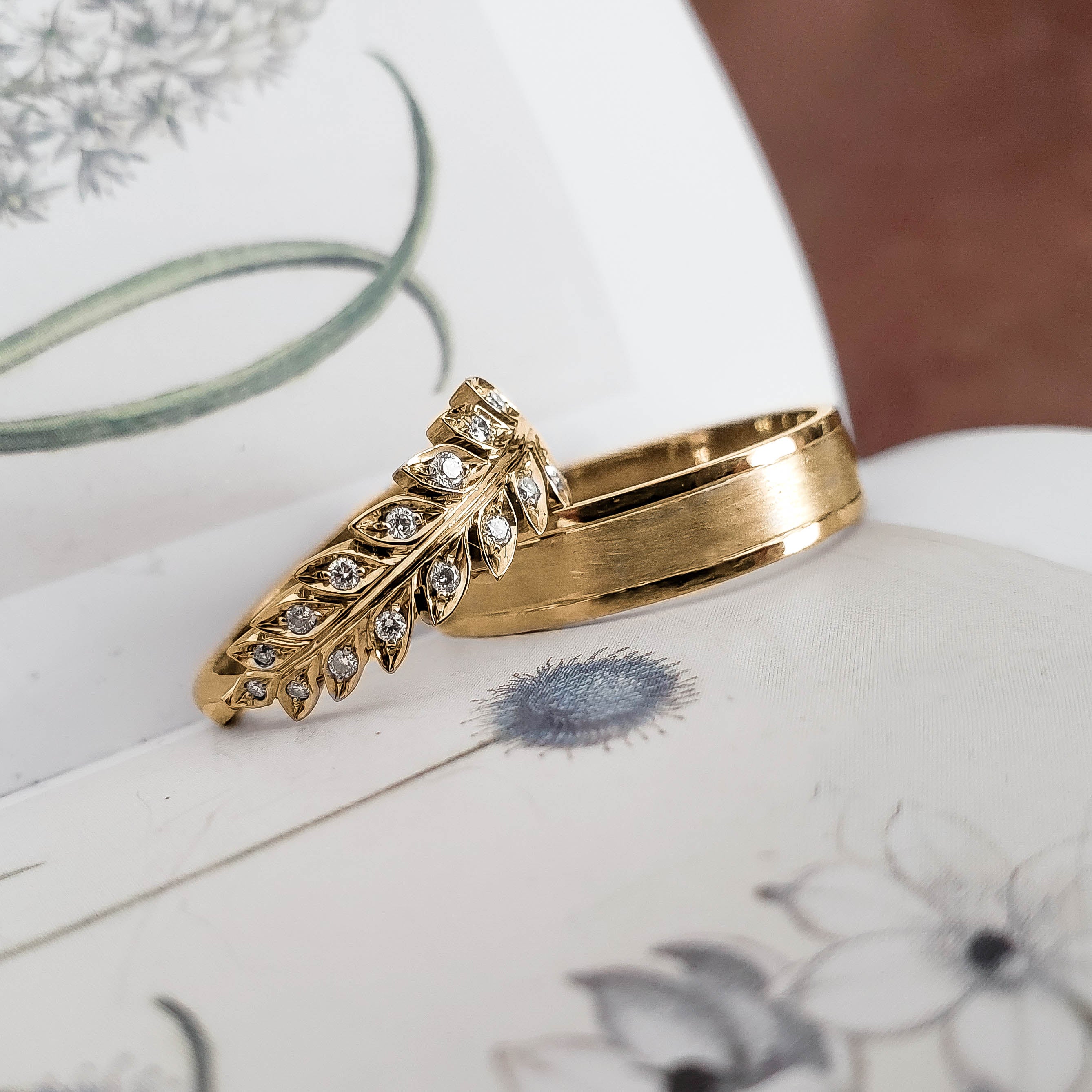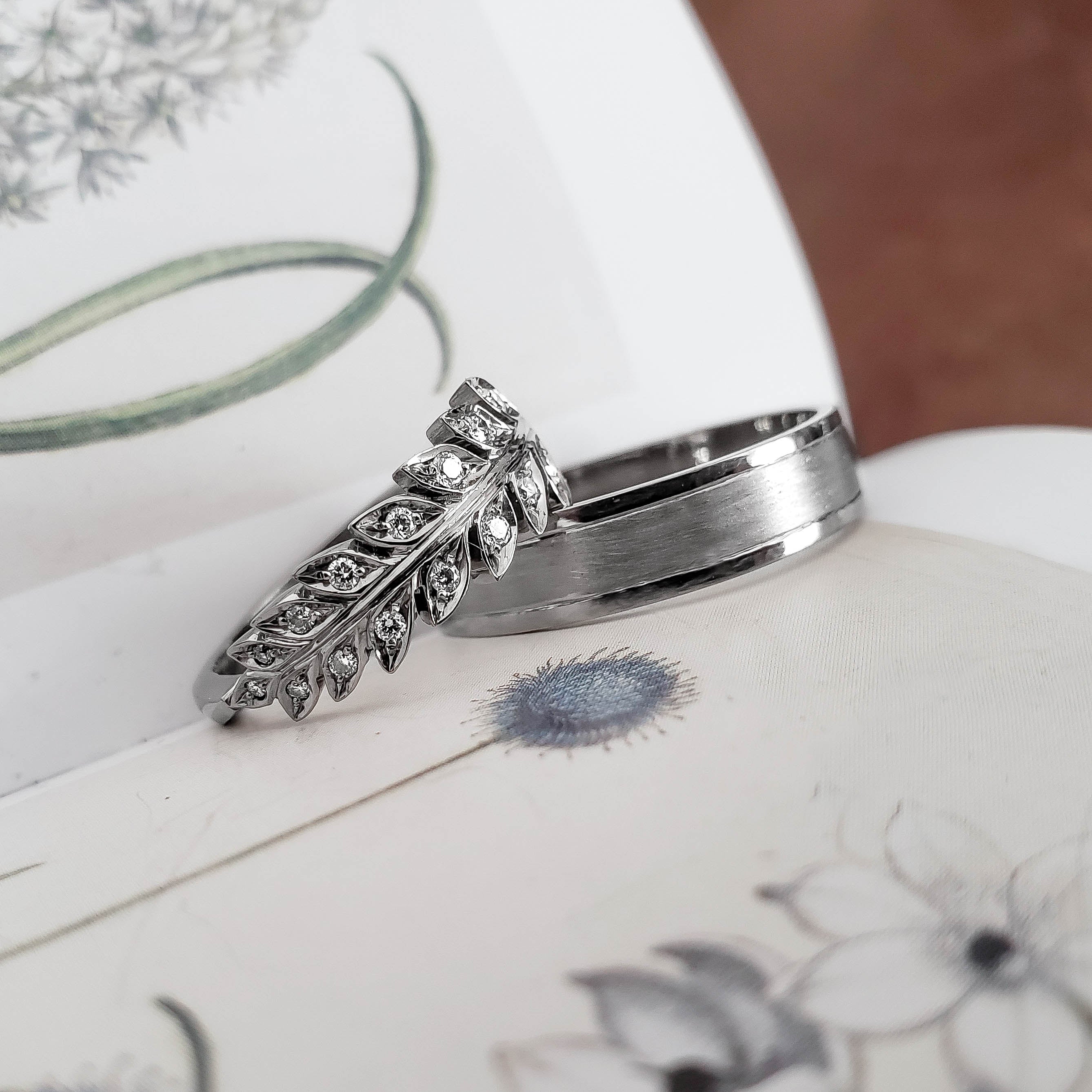 Argollas con diseños distintos. En este caso, la argolla femenina tiene un diseño de hojas de menor a mayor tamaño con diamantes engastados. El anillo masculino está hecho con doble textura, al centro satinado y a los lados brillante.