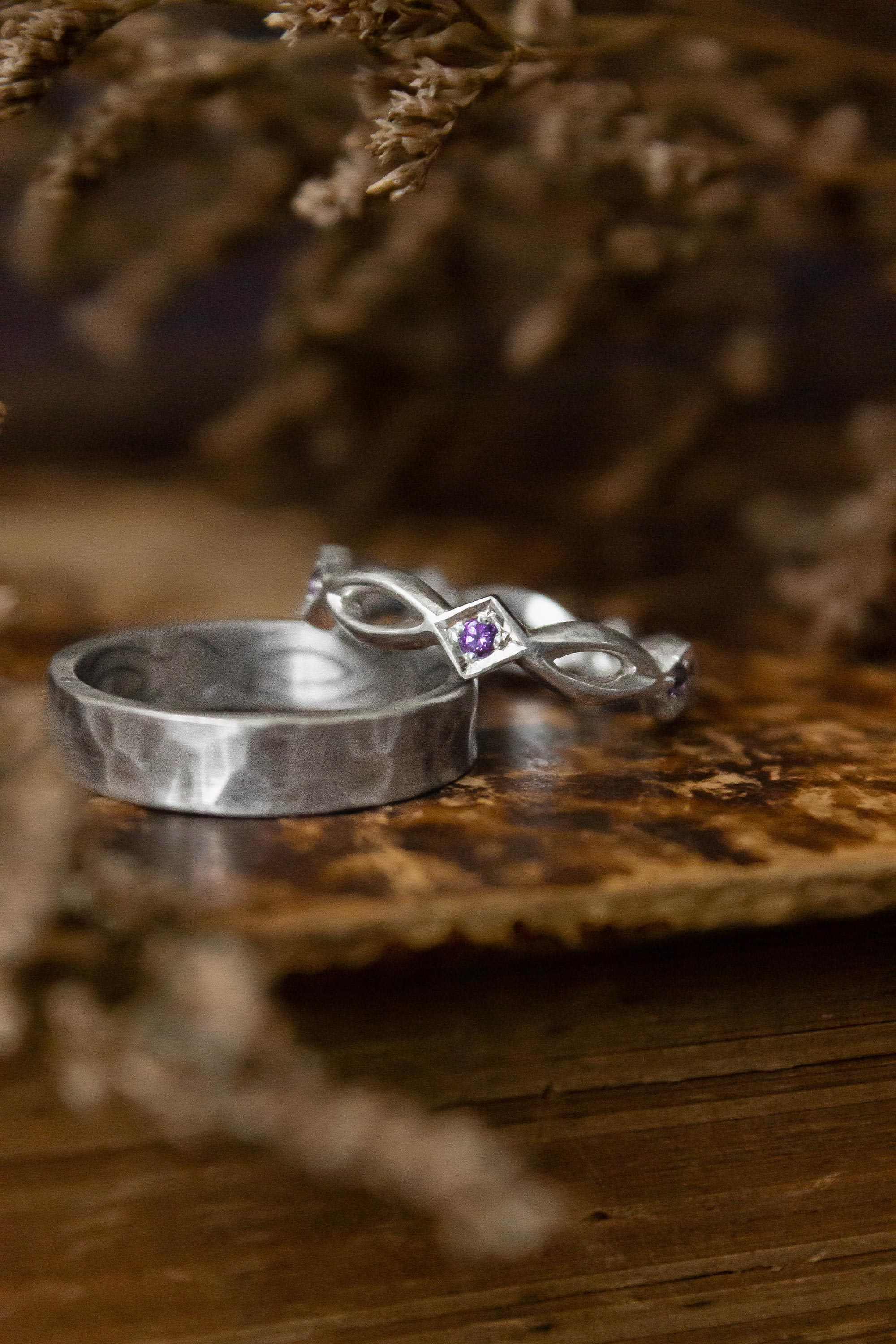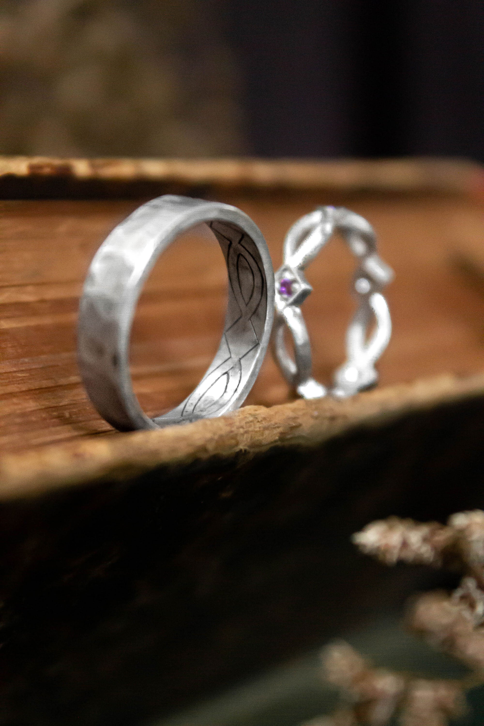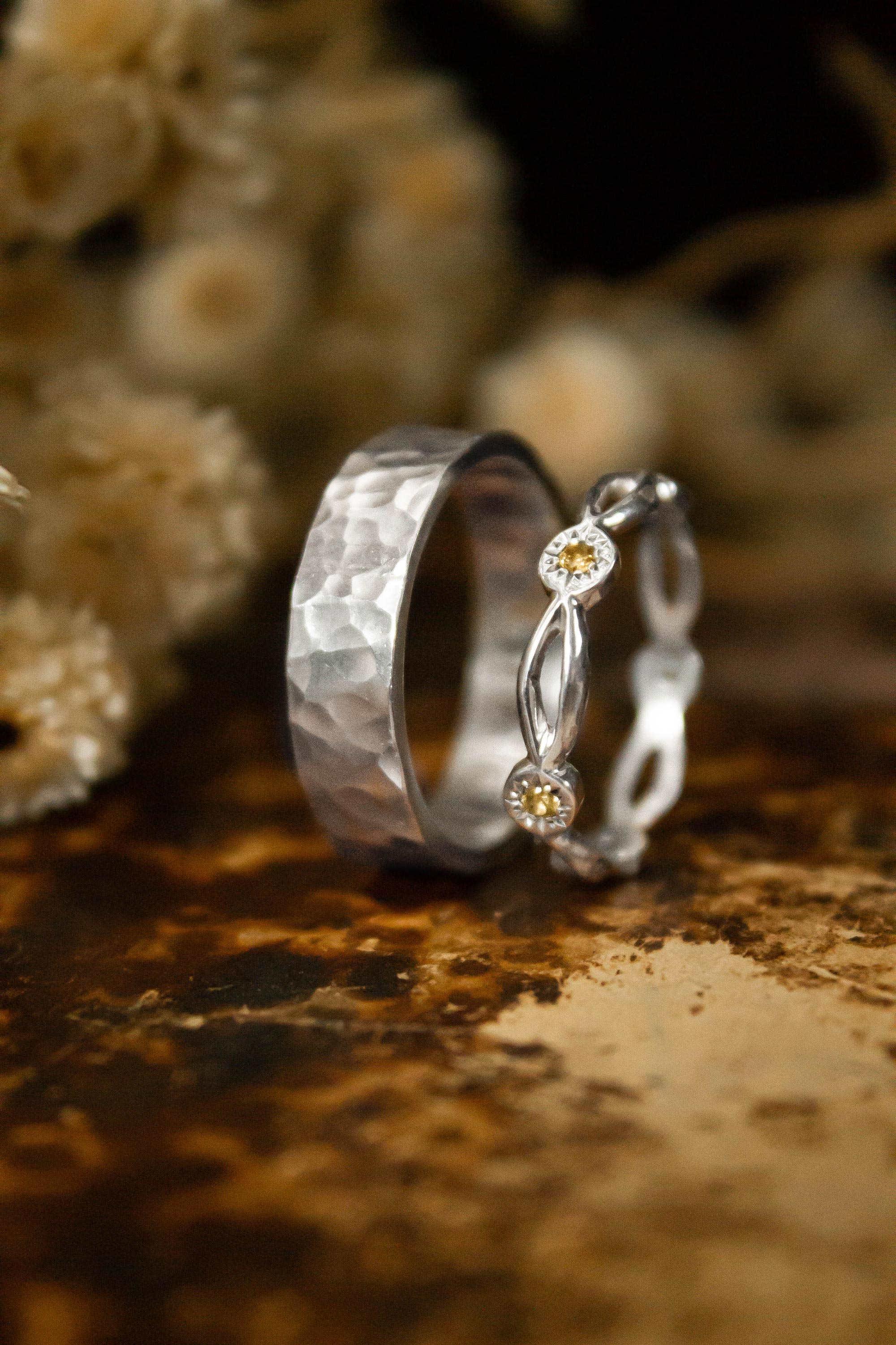 Estas argollas tienen una mezcla entre calado para la mujer con piedras y una textura martillada en la argolla del hombre. La forma en que conversan depende de cada pareja. En el caso de las argollas de amatista, el anillo masculino tiene un grabado interior que tiene la forma de la argolla femenina. En el caso de las de citrino, el tema era el sol y la luna, por ende, el anillo femenino representaba soles y el anillo masculino tenía dentro un grabado de media luna.