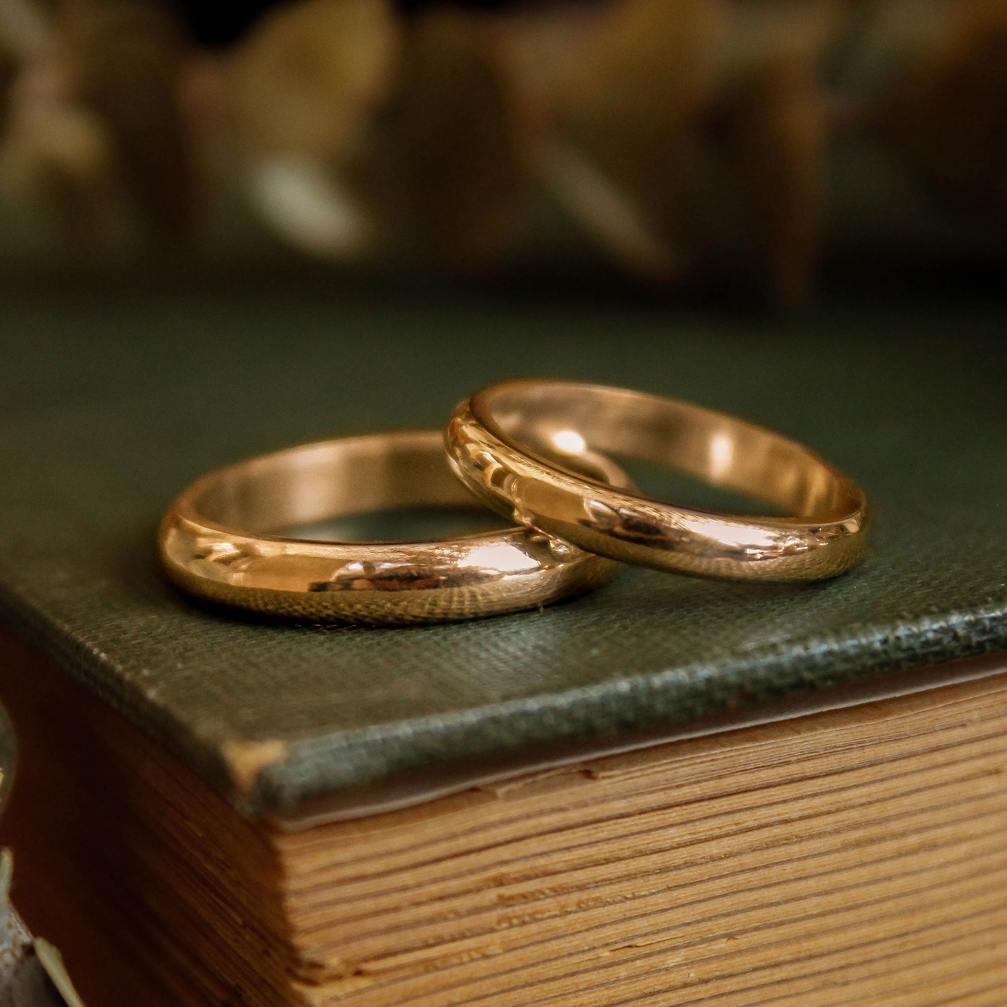 Argollas de matrimonio delgadas con acabos distintos, la argolla grande tiene forma de “media caña” quiere decir que es circular y un acabado brillante, mientras que la argolla pequeña tiene una forma lisa pero un acabado satinado.